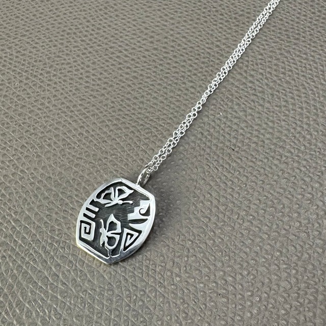 ホピ族のアーティストであるEffie Tawahongvaのオーバーレイトップ。 トゥファストーンと呼ばれる石にデザインを刻み、その中にシルバーを流し込むトゥファキャスト技法により制作されています。 翼をイメージした手の込んだ素晴らしい作品です。 ホピジュエリー好きの方にぜひ! ■サイズ:縦4.8cm 横2.8cm ■チェーン:48cm ■素材:STERLING SILVER=SILVER925