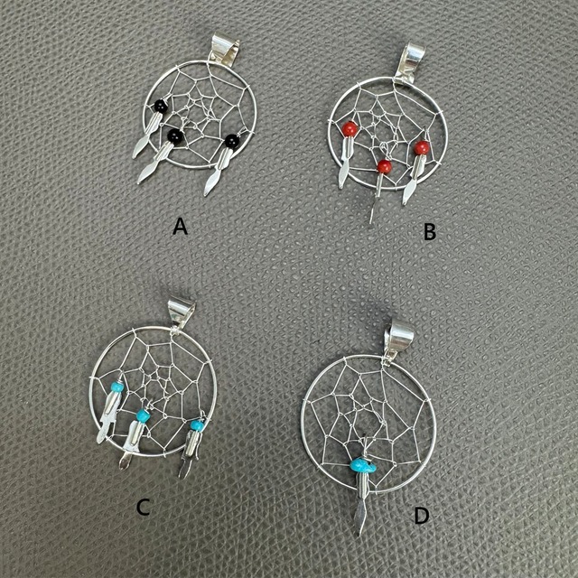 NAVAJO族 アーティスト作 ドリームキャッチャートップです。 ネイティブアメリカンに伝わる、ドリームキャッチャーは悪い夢や悪い気をクモの巣状の網に引っ掛け、良い夢だけが網を通り抜け、羽を伝って眠る人に降りてくると信じられています。 インディアンジュエリー好きの方に是非! ■サイズ A:たて4.0cm×よこ2.6cm B:たて4.4cm×よこ2.7cm C:たて3.8cm×よこ2.7cm D:たて4.3cm×よこ2.7cm ※チェーンは別売りです。