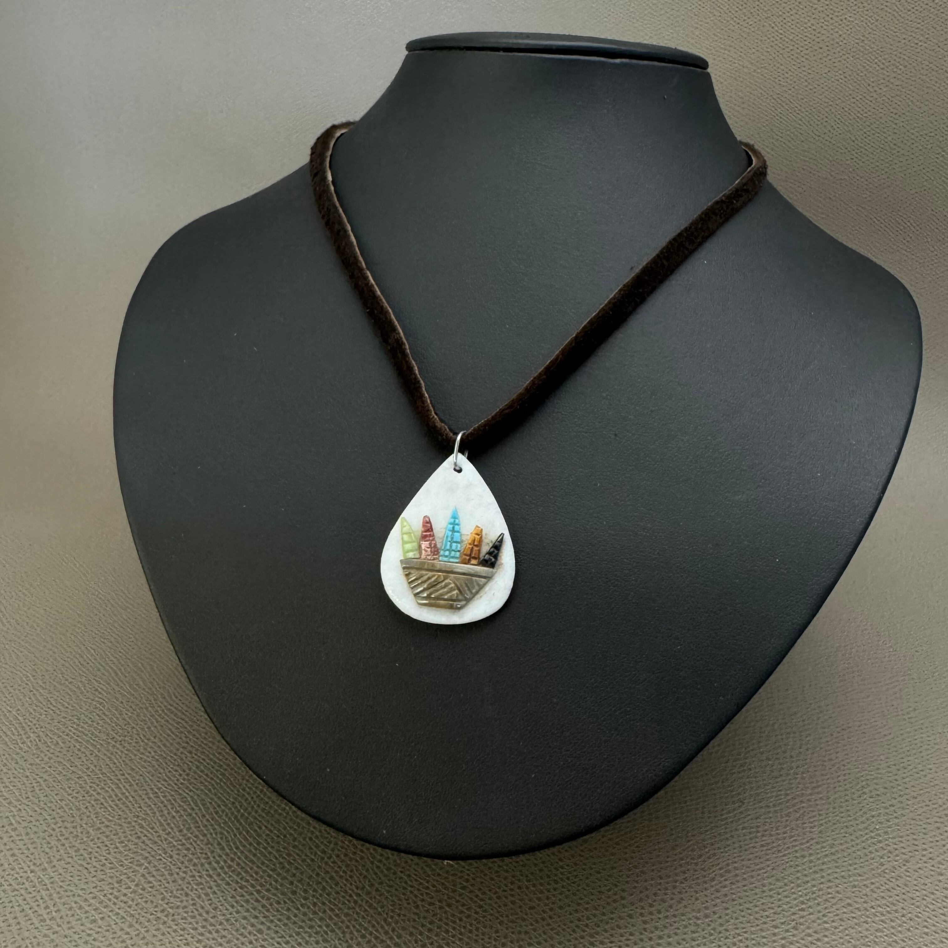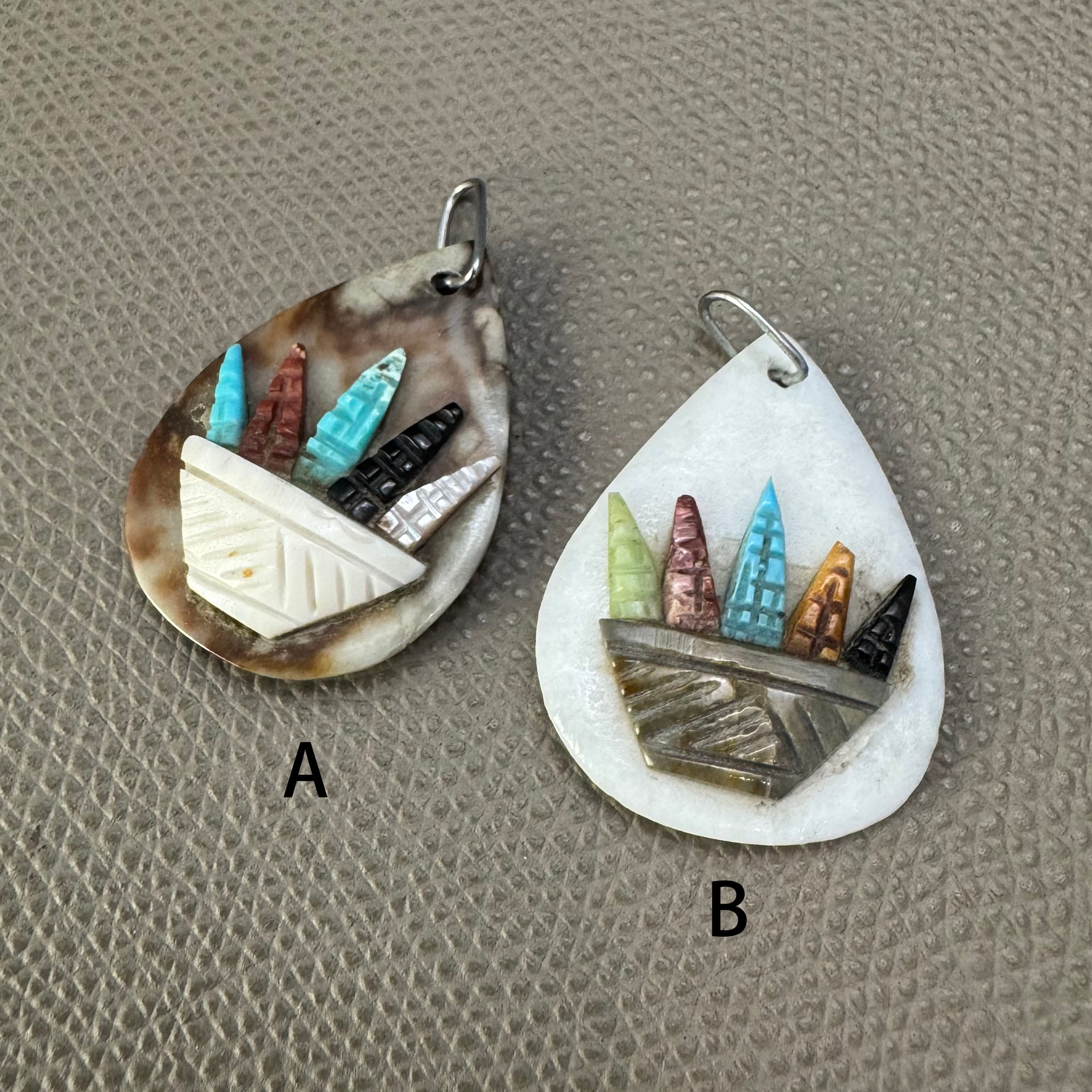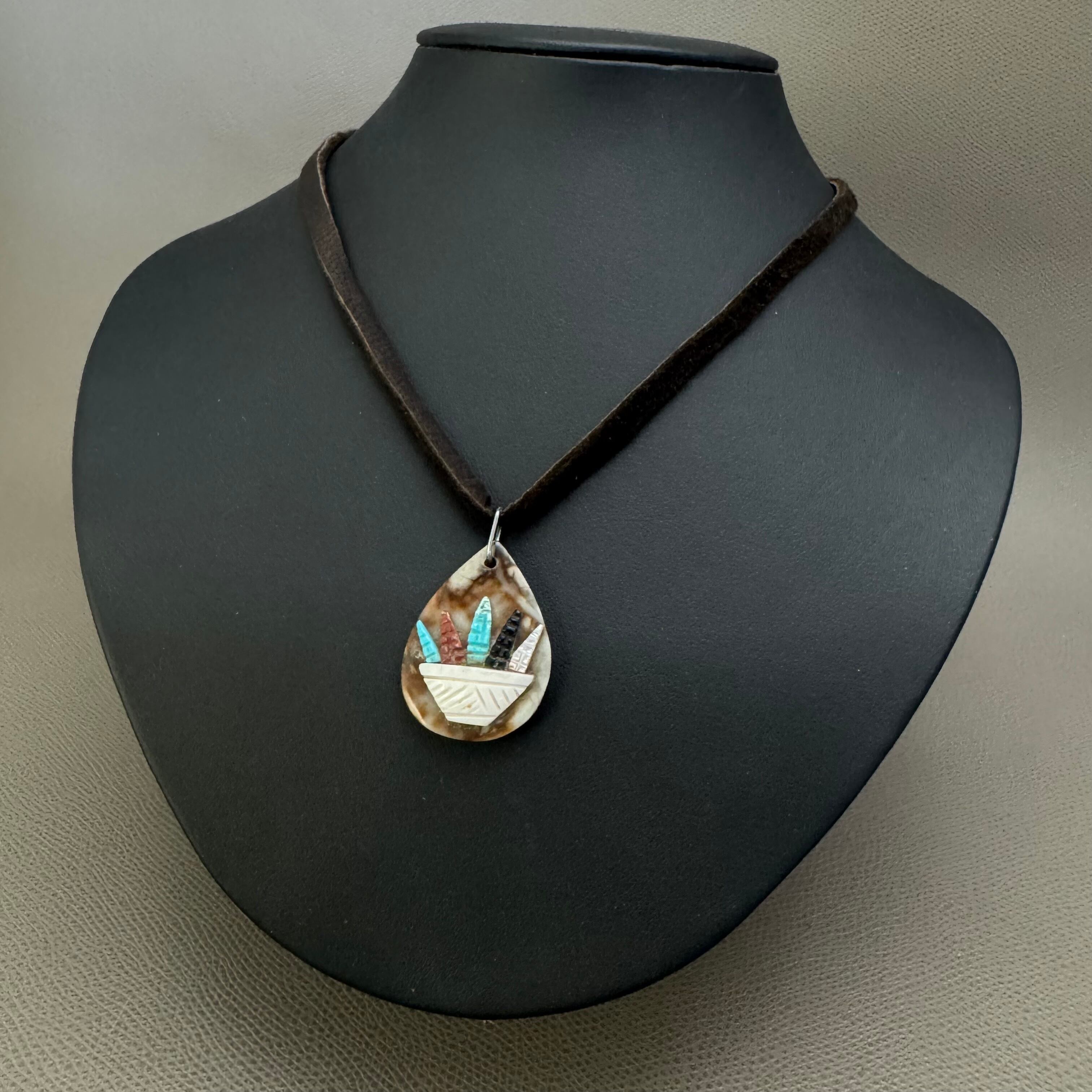 ターコイズやジェットなどのコーンがバスケットに入った非常にかわいらしく、ズニ族の生活を伺わせる作品となっております。