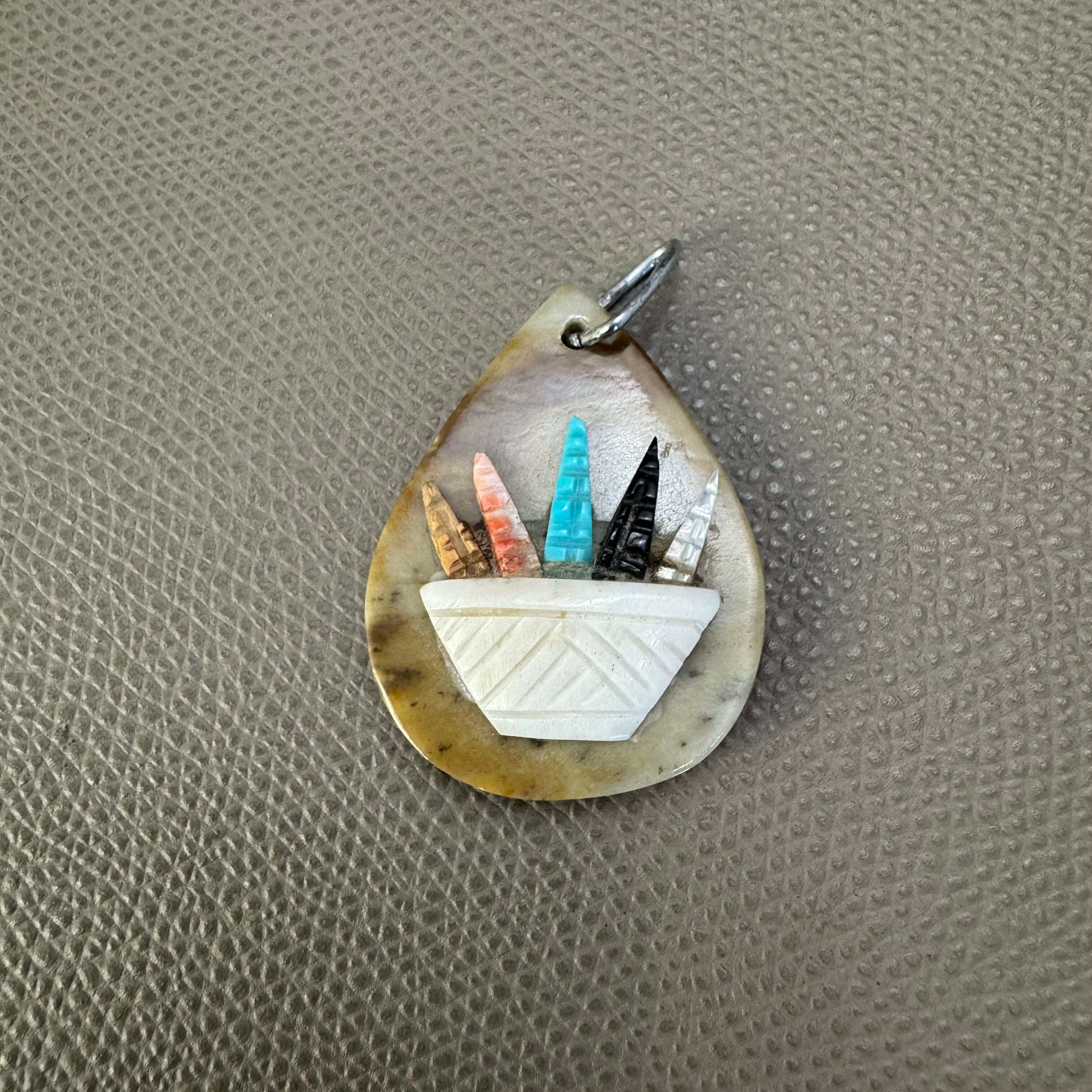 ターコイズやジェットなどのコーンがバスケットに入った非常にかわいらしく、ズニ族の生活を伺わせる作品となっております。
