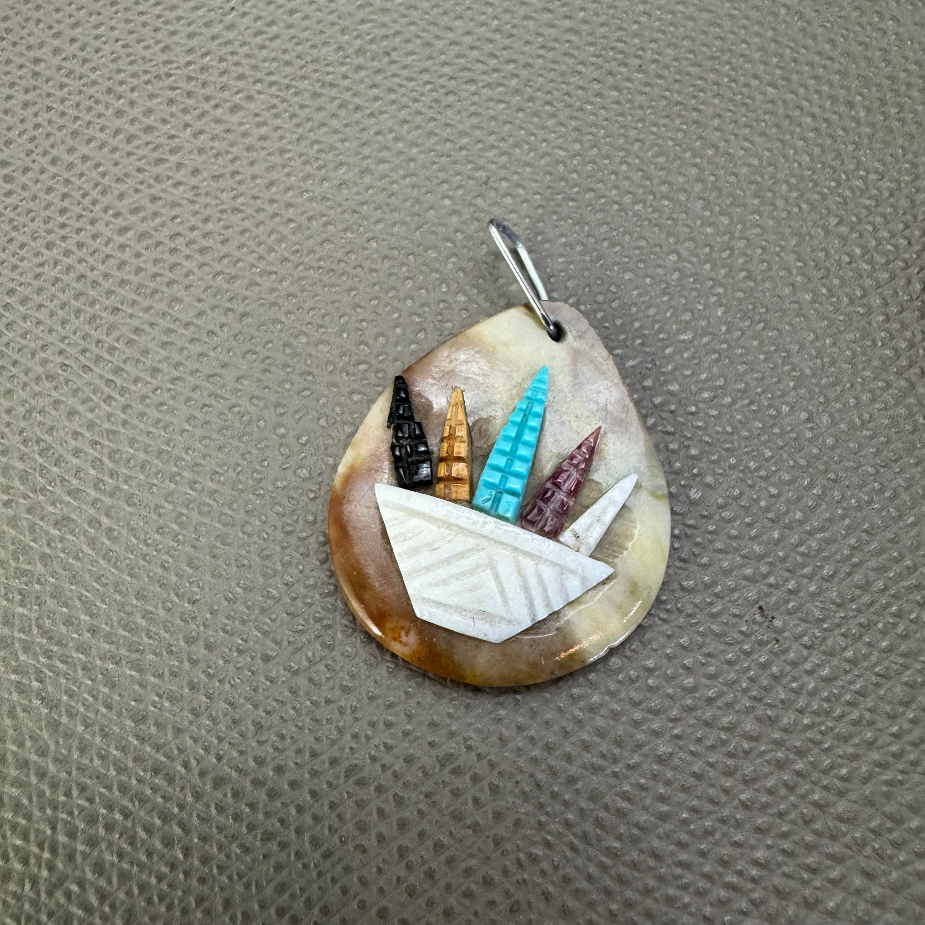 ターコイズやジェットなどのコーンがバスケットに入った非常にかわいらしく、ズニ族の生活を伺わせる作品となっております。