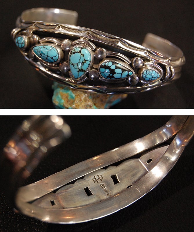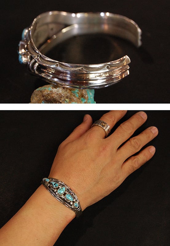 力強いスタンプワークと非常に美しいChina Mountainターコイズがセットされています。