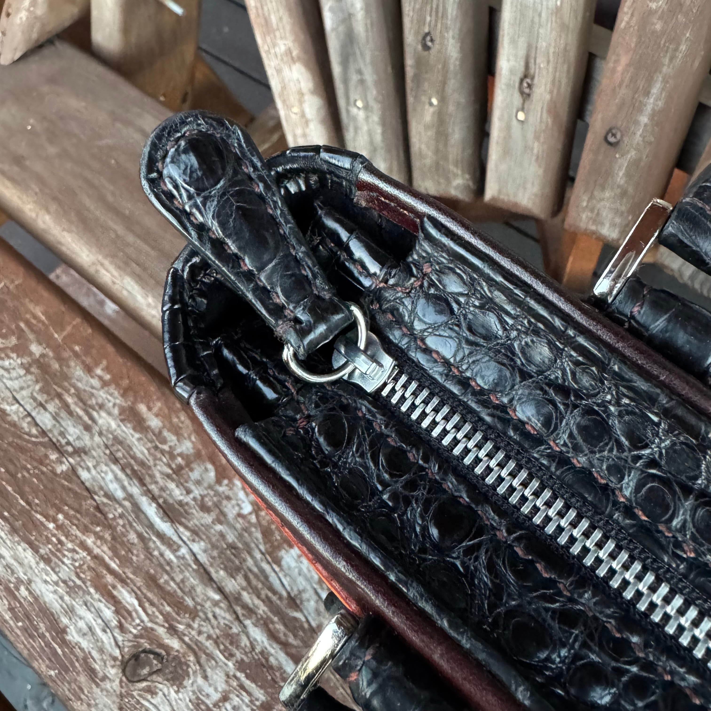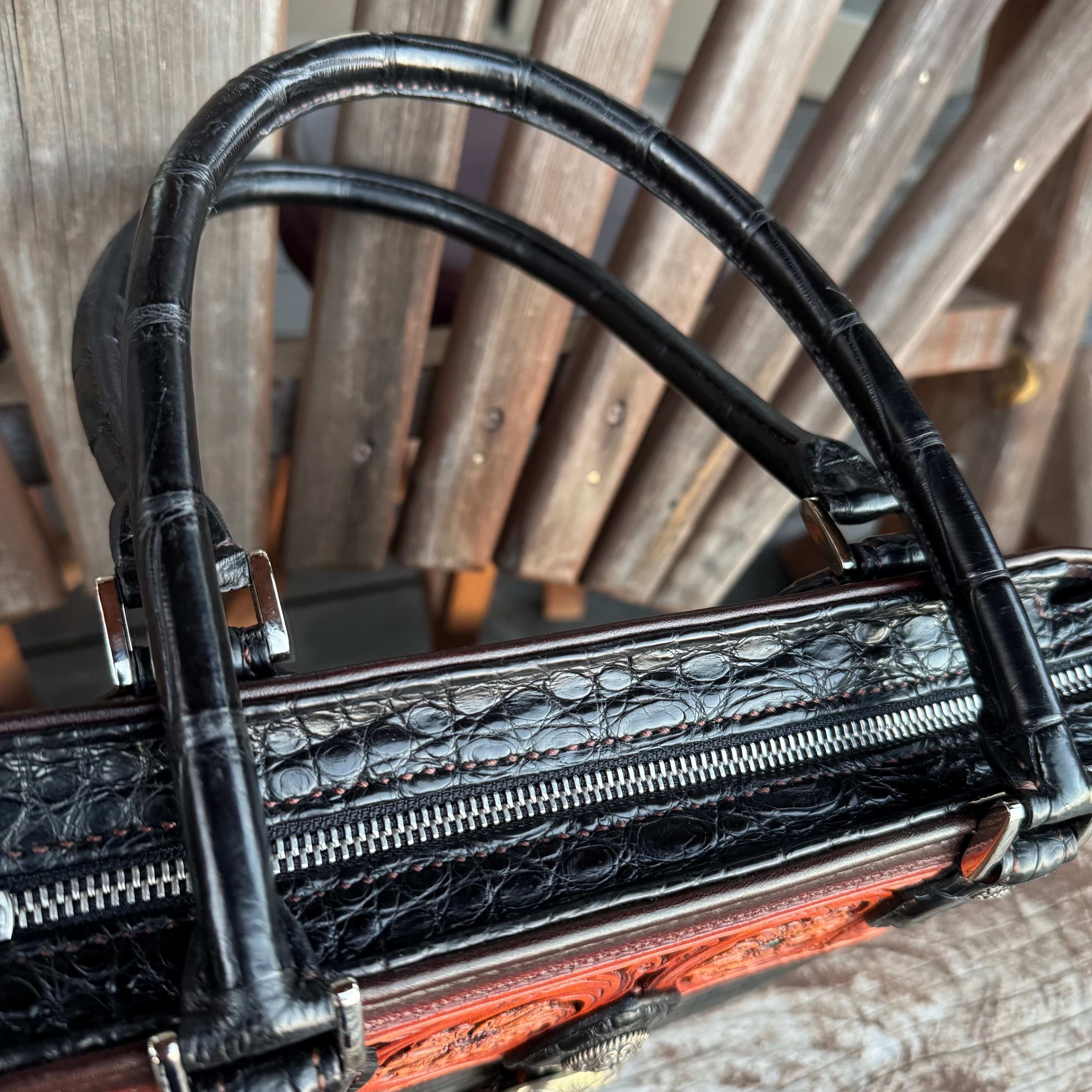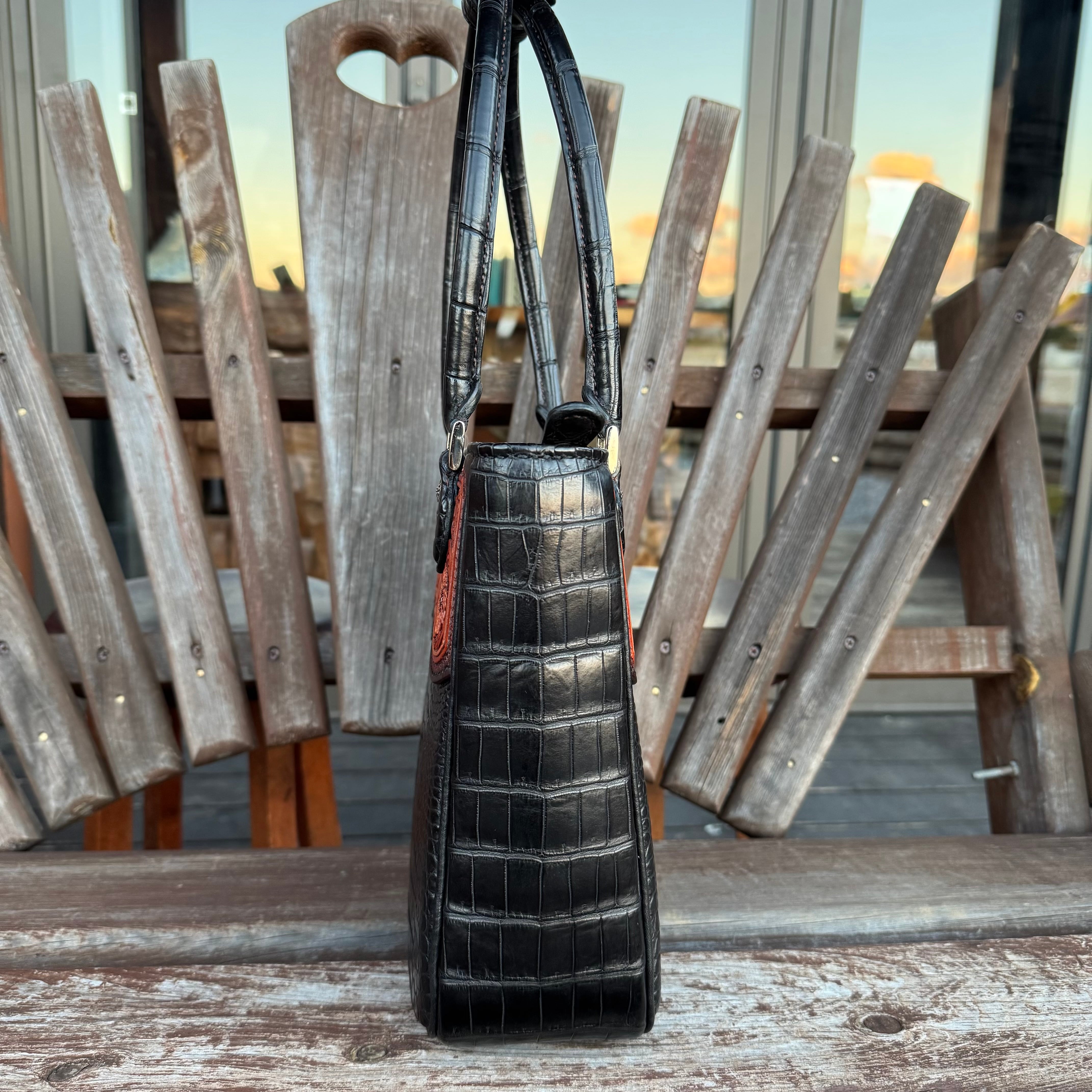 レザークラフトWHOLオリジナル ナイルクロコダイル&カービングトートバッグ ハンドメイド 手縫い カバン ショルダー 本革 牛革 ワニ革 ブラック