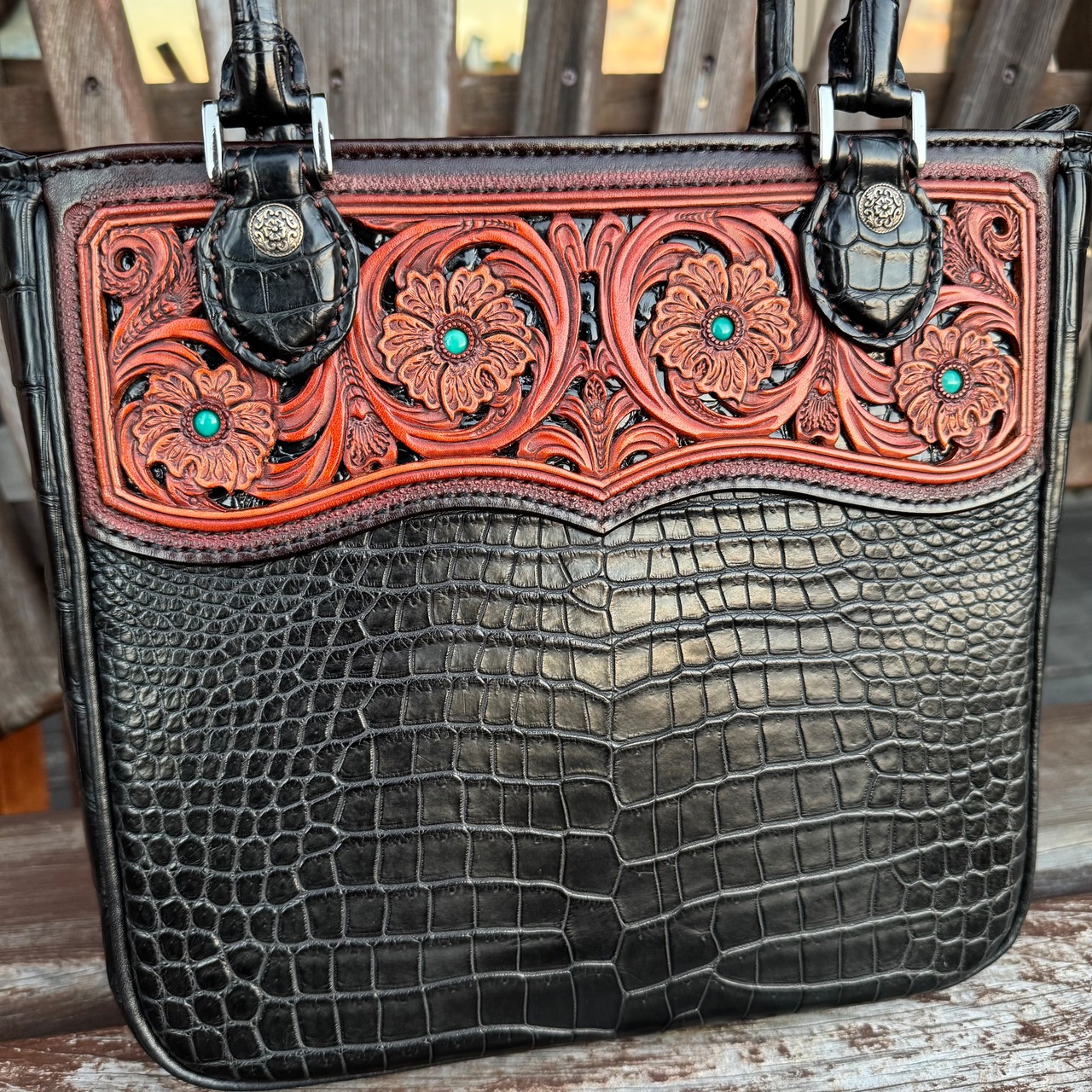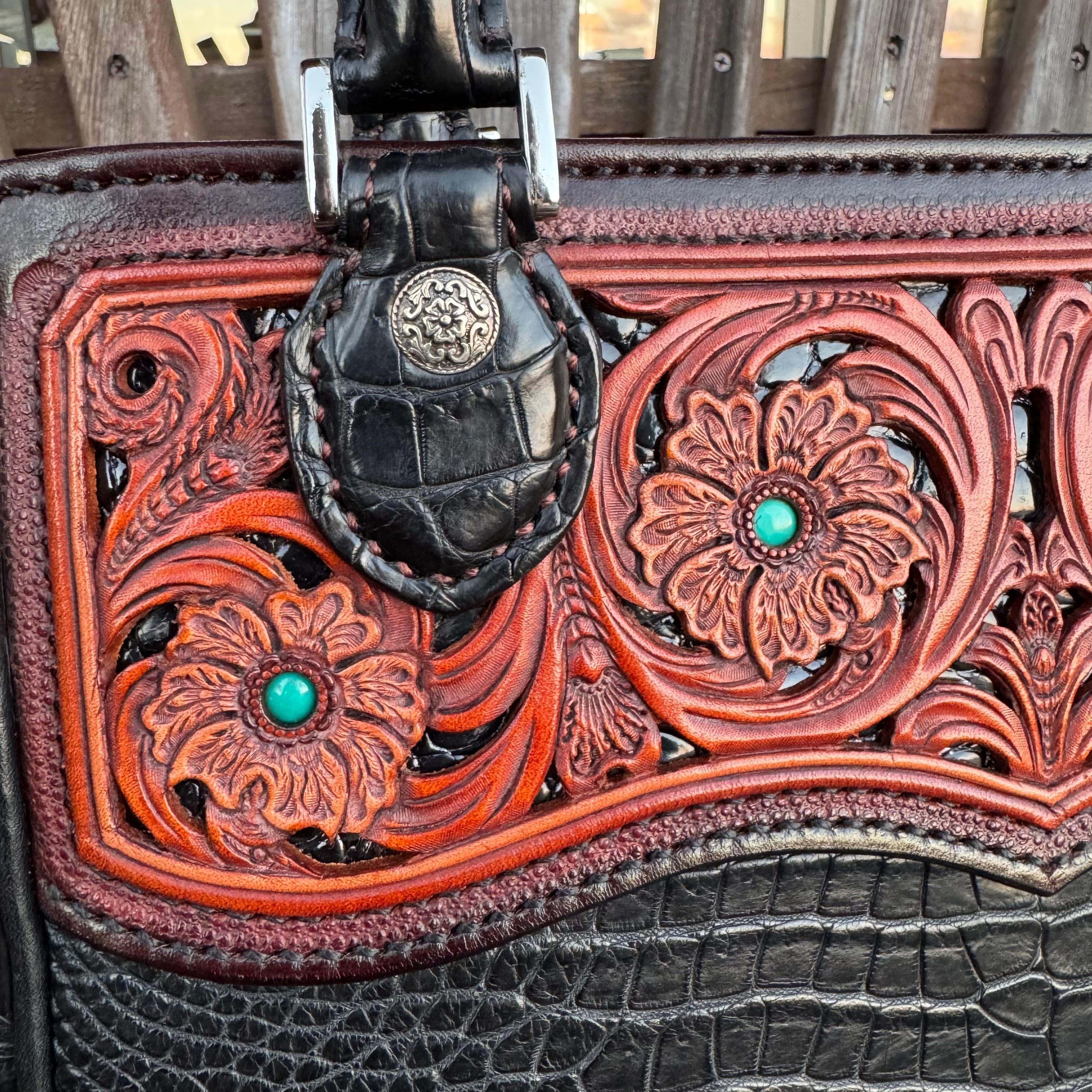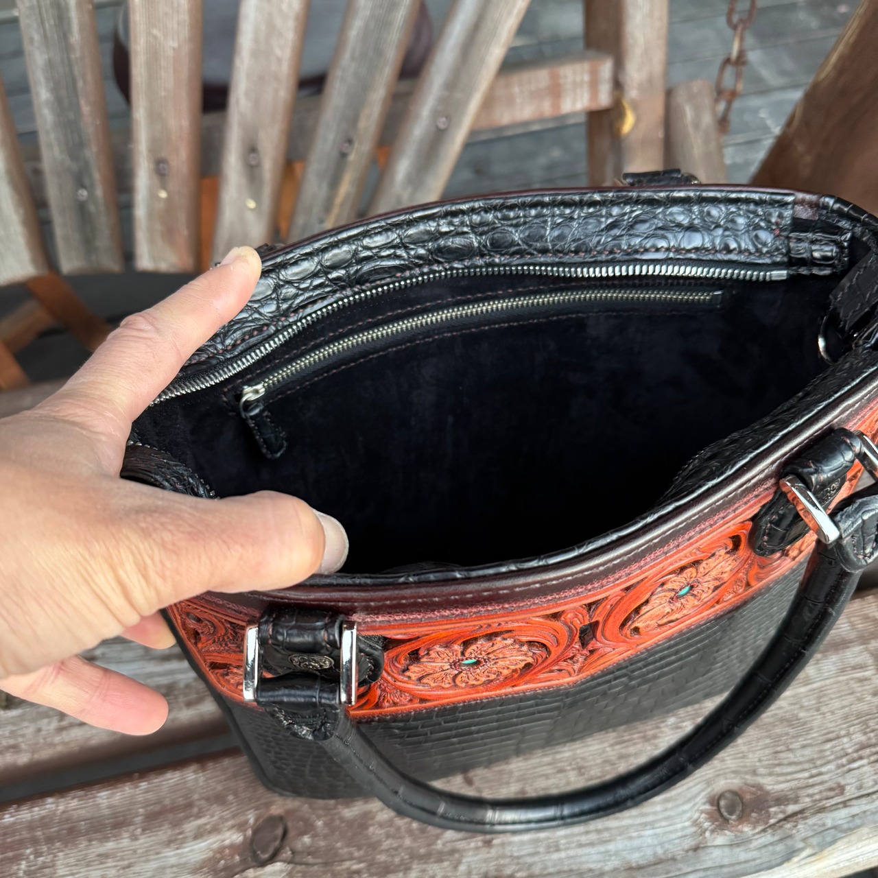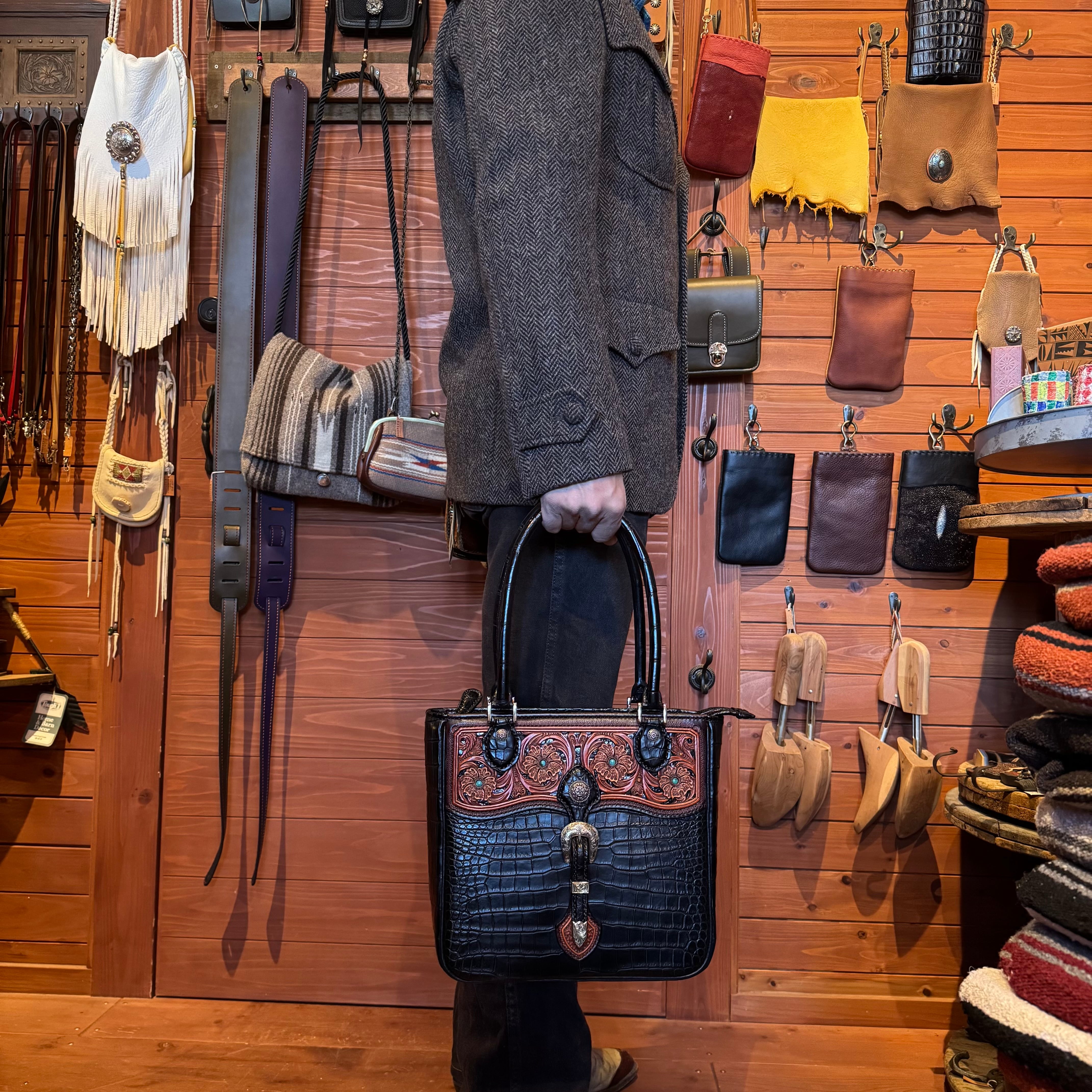 レザークラフトWHOLオリジナル、レザーカービング&クロコダイルレザー トートバッグ。
