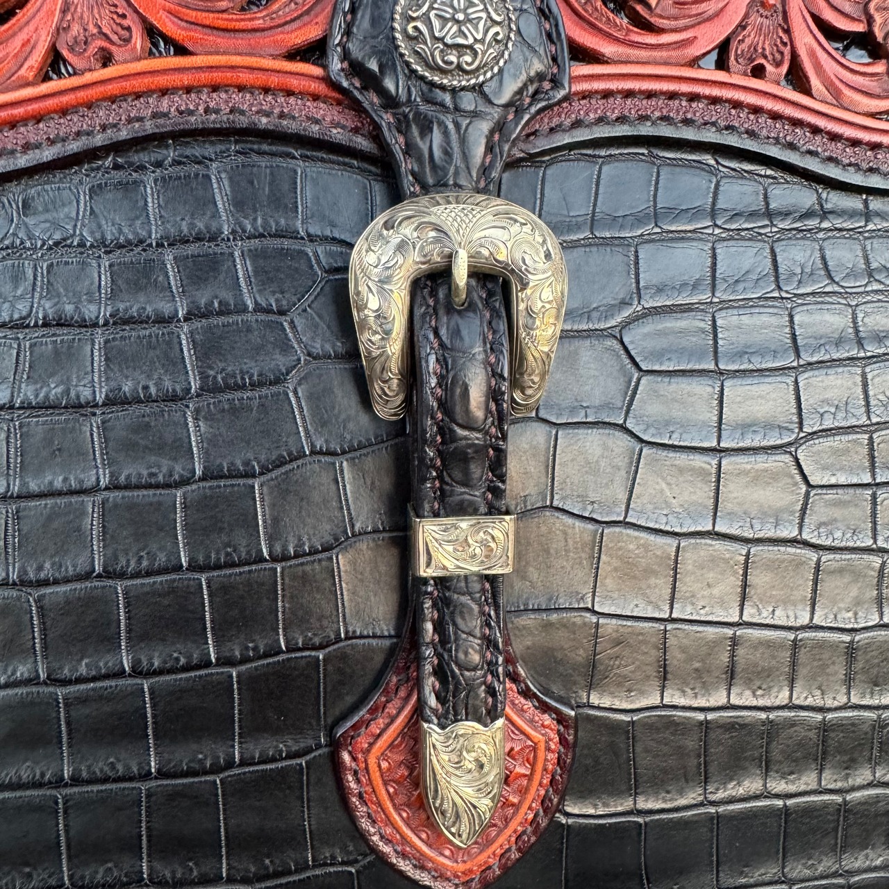 本体はフルクロコダイルレザーを使用し、本体上部にはレザーカービングを施しています。