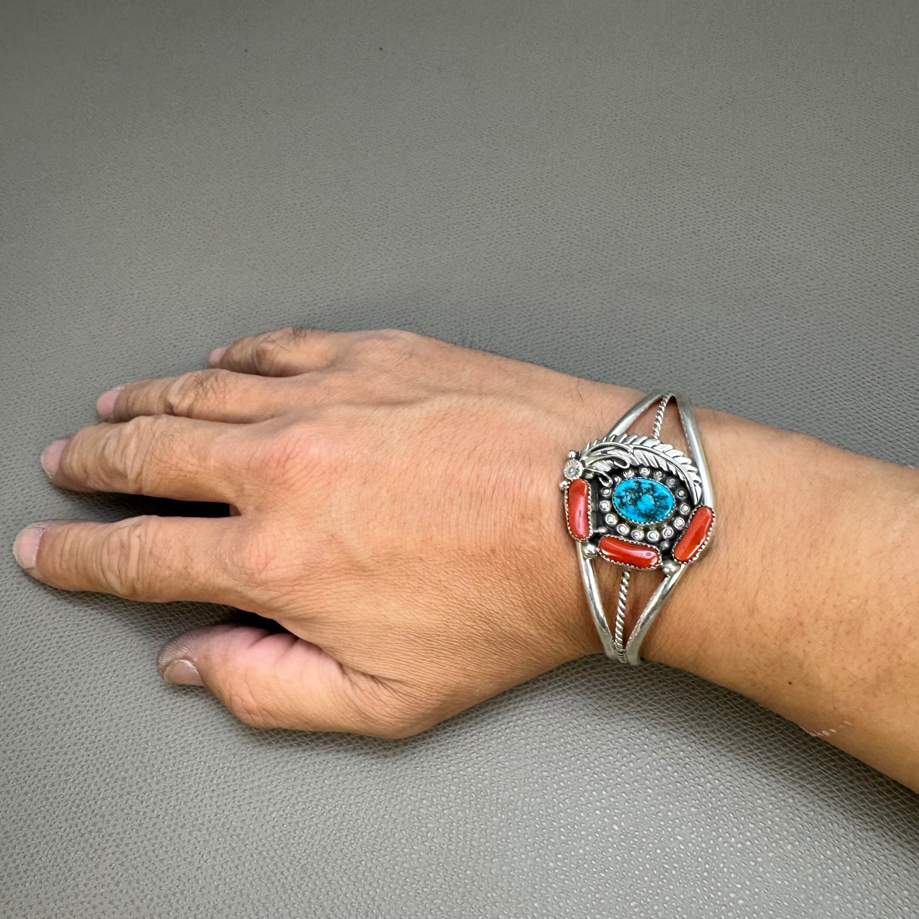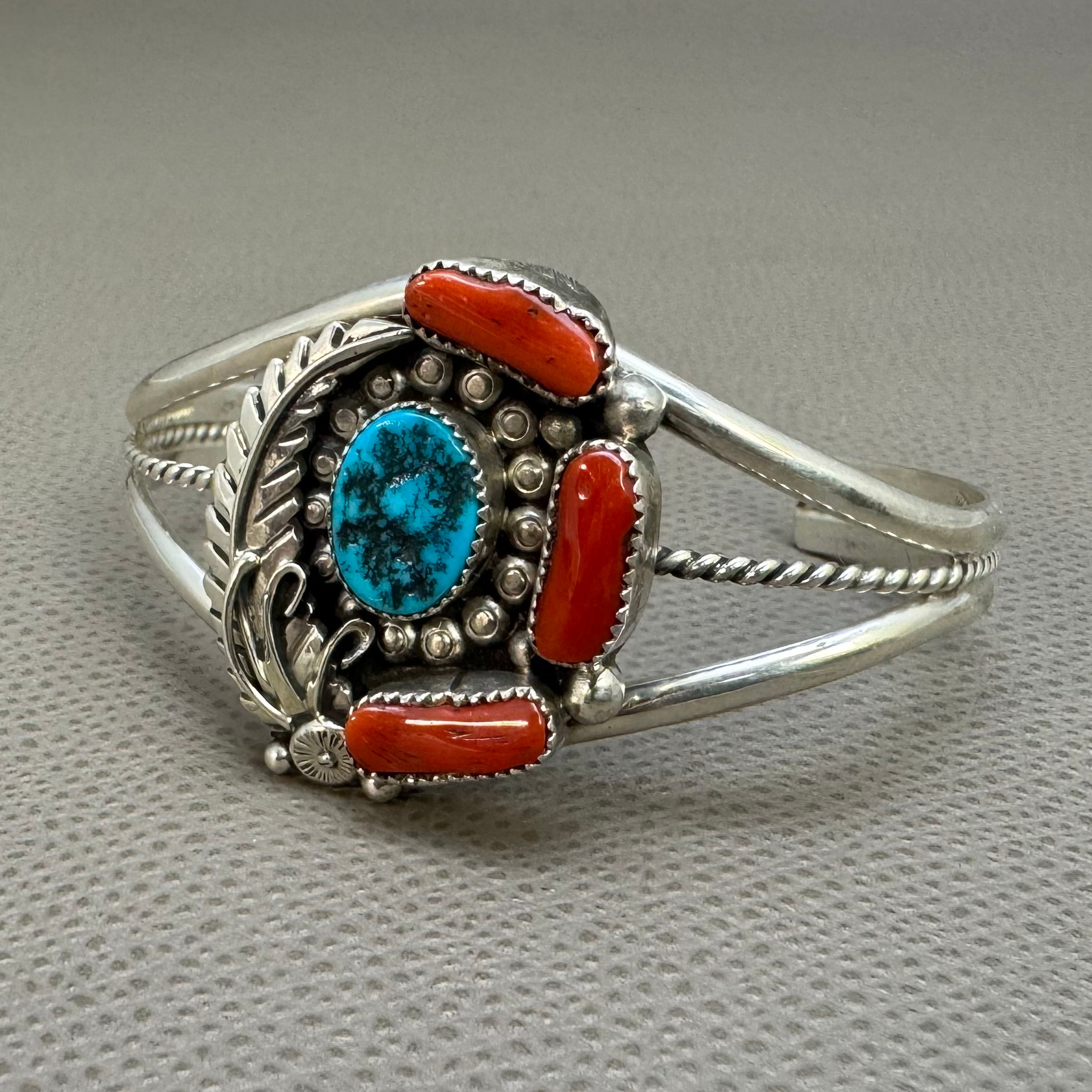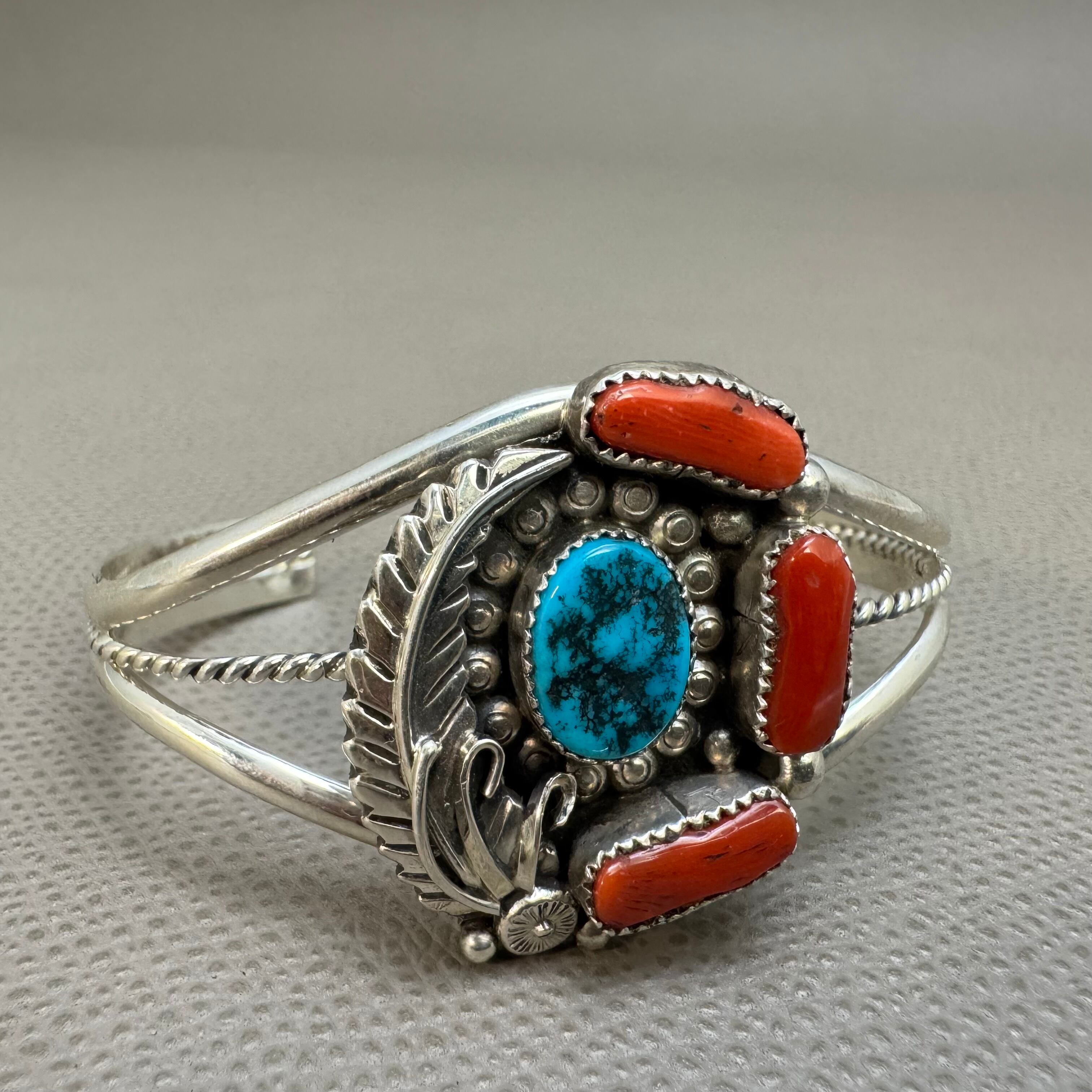 ターコイズの周りにコーラルをあしらい、リーフモチーフを使った伝統的なスタイルのバングルです。