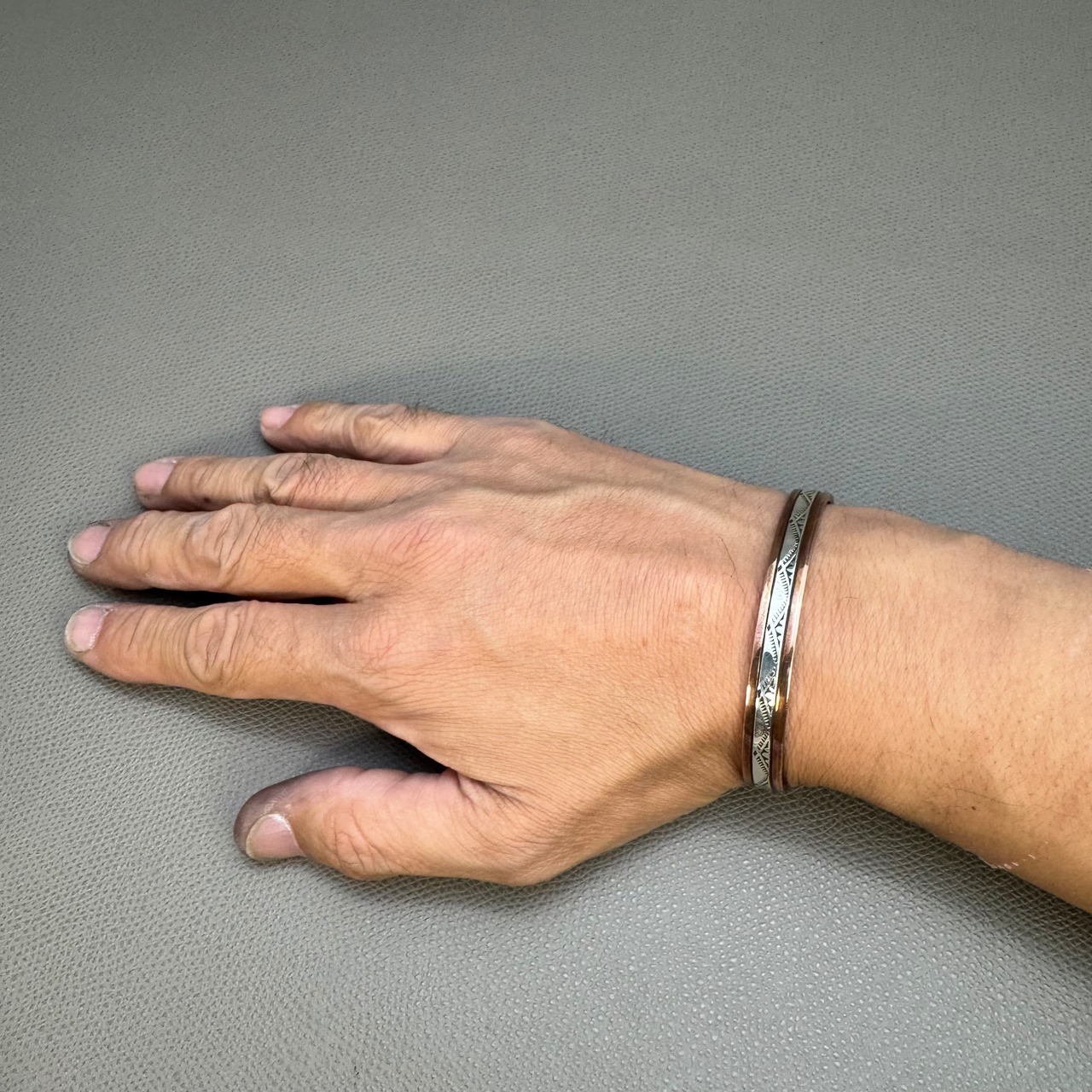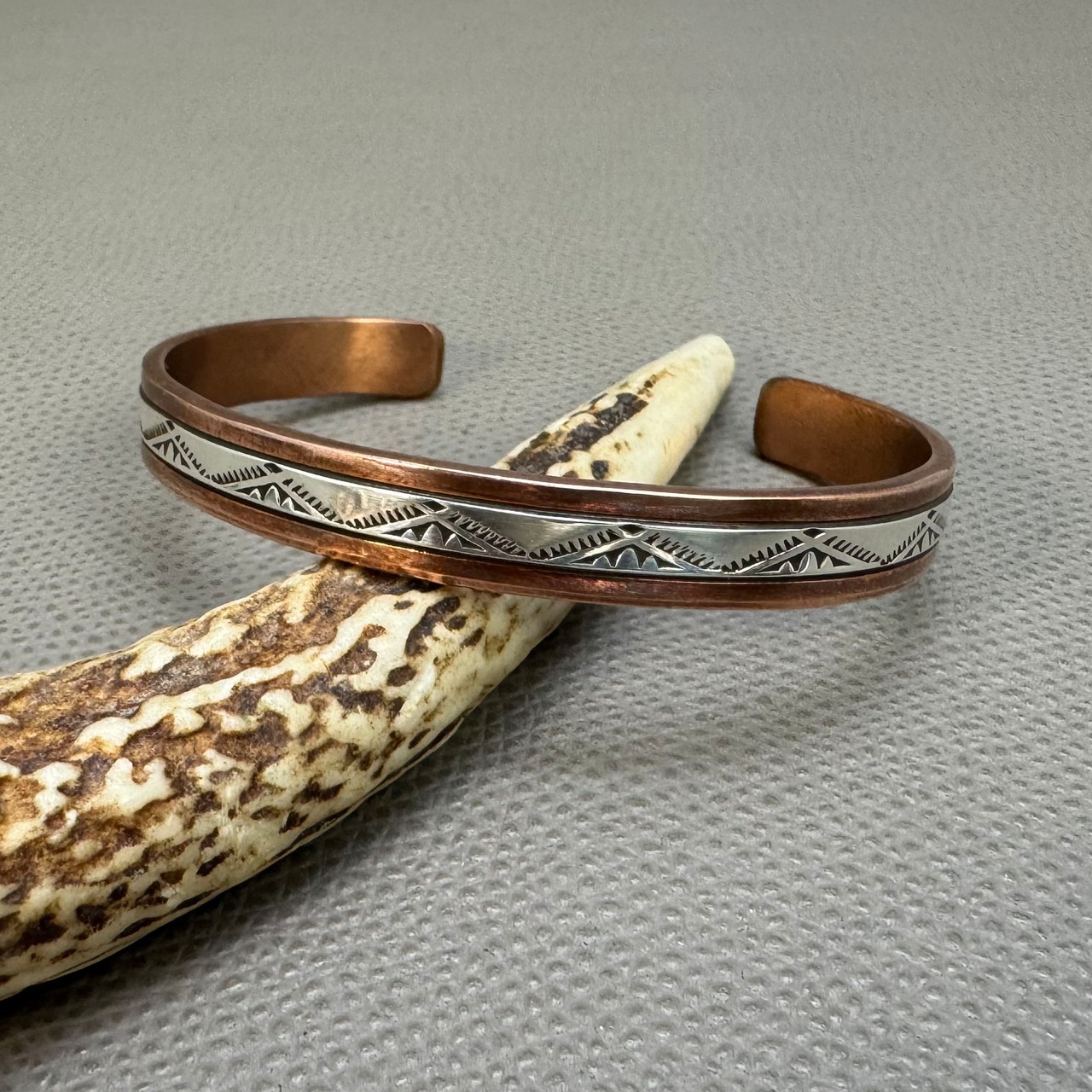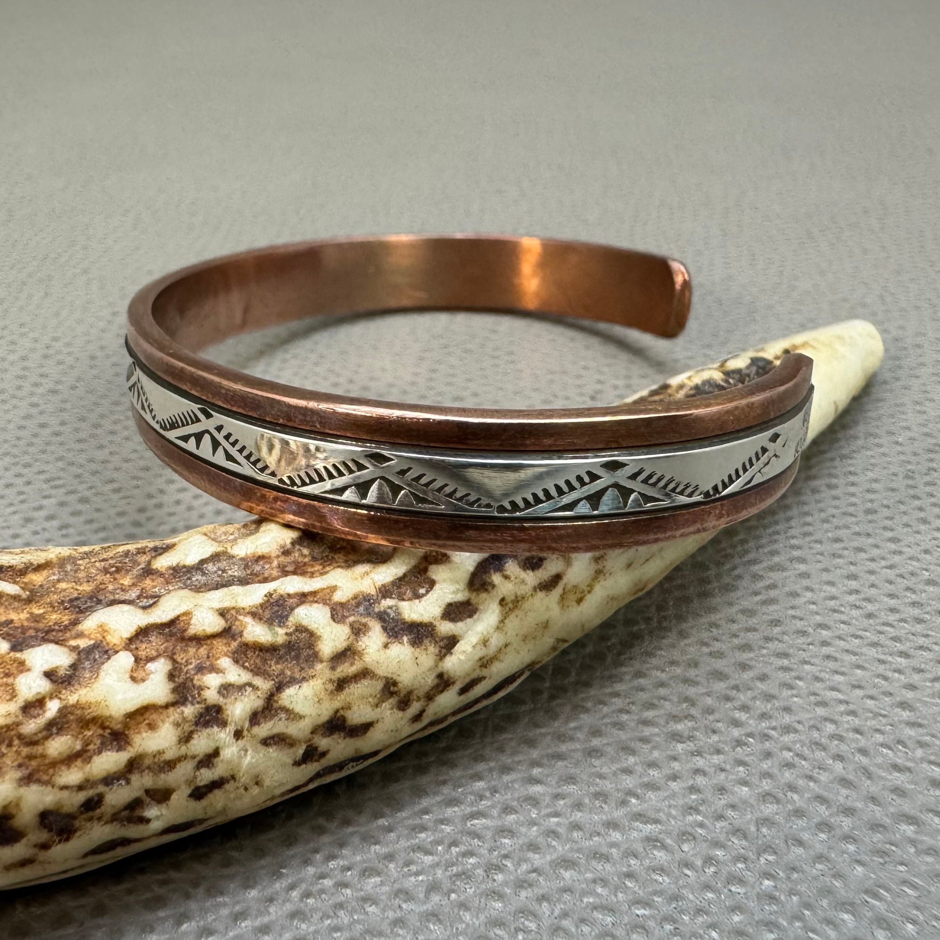 ランディ・セカテロとシルヴァーナ・アパッチ夫婦による銅とシルバーを組み合わせた力強いスタンプワークの作品です。