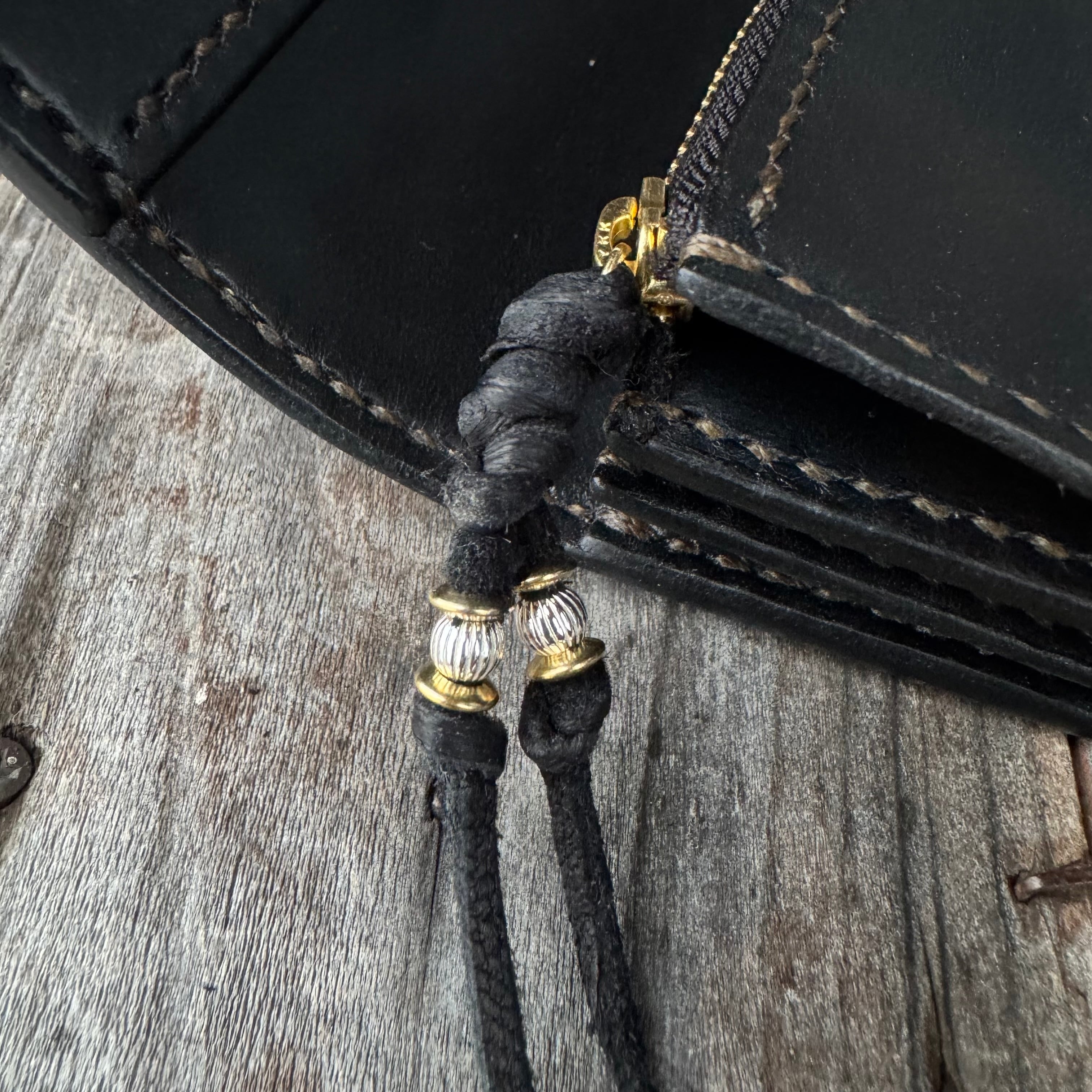 中パーツの革を薄くすることで使いやすさを追求し、なおかつ強度を持たせるために口部分に返し縫を施してます。