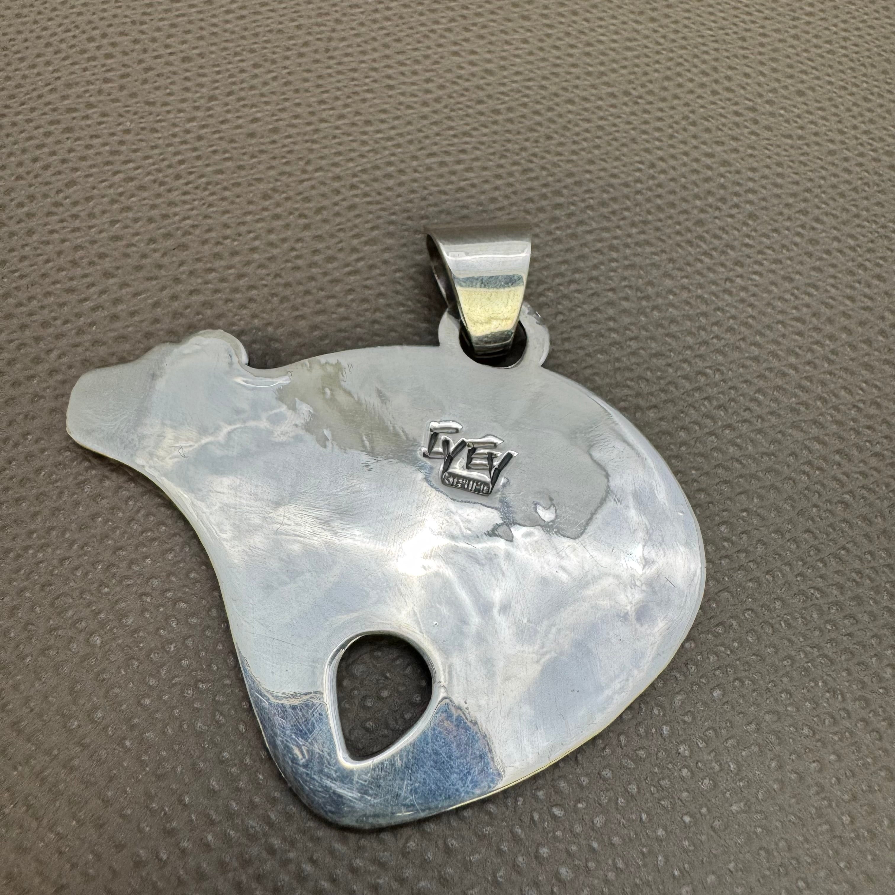 ホピ族の伝統的な技法である「オーバーレイ」で作られた作品で、上のプレートにデザインを描き、糸鋸で切り絵のように切り抜き、その後下のプレートと貼り合わせます。