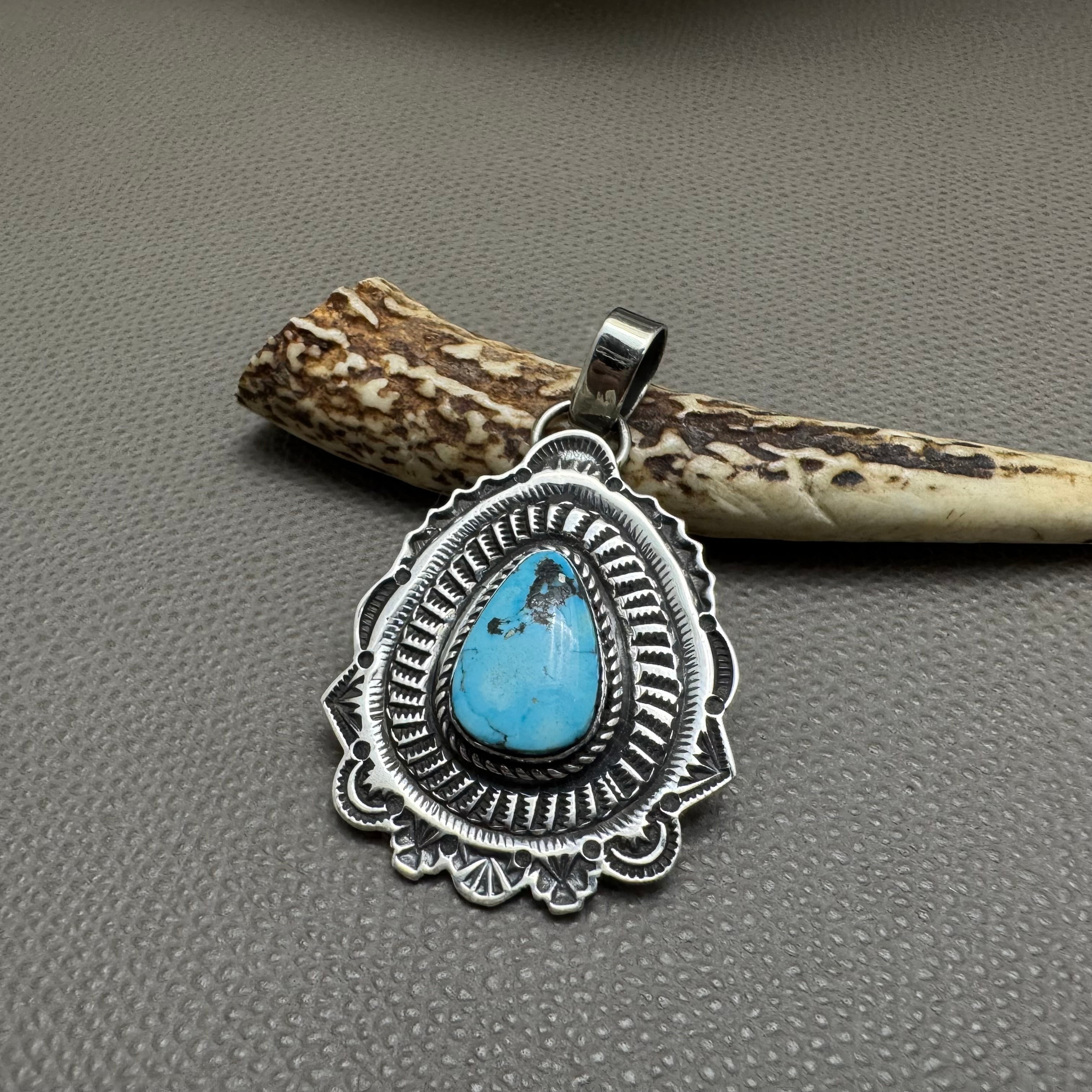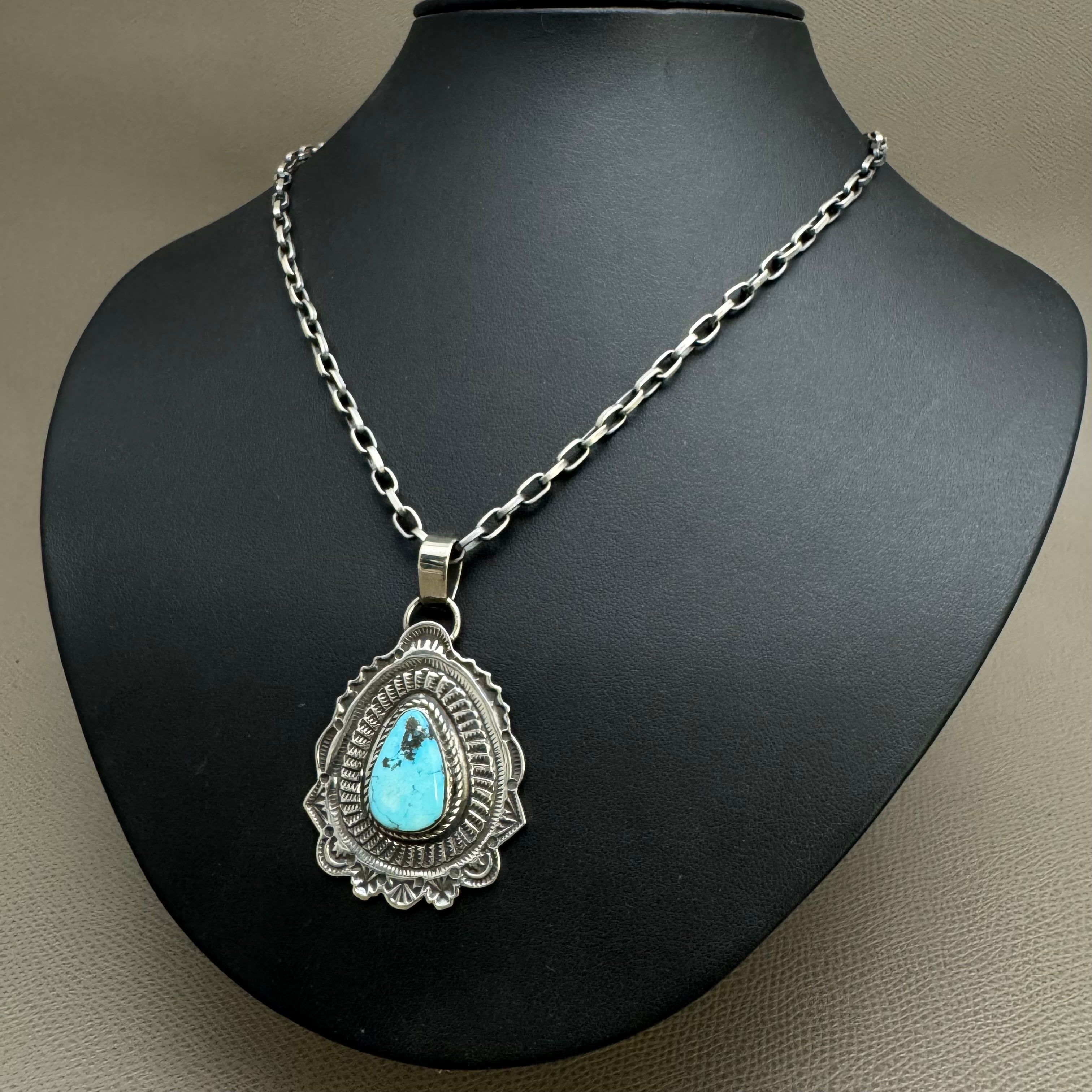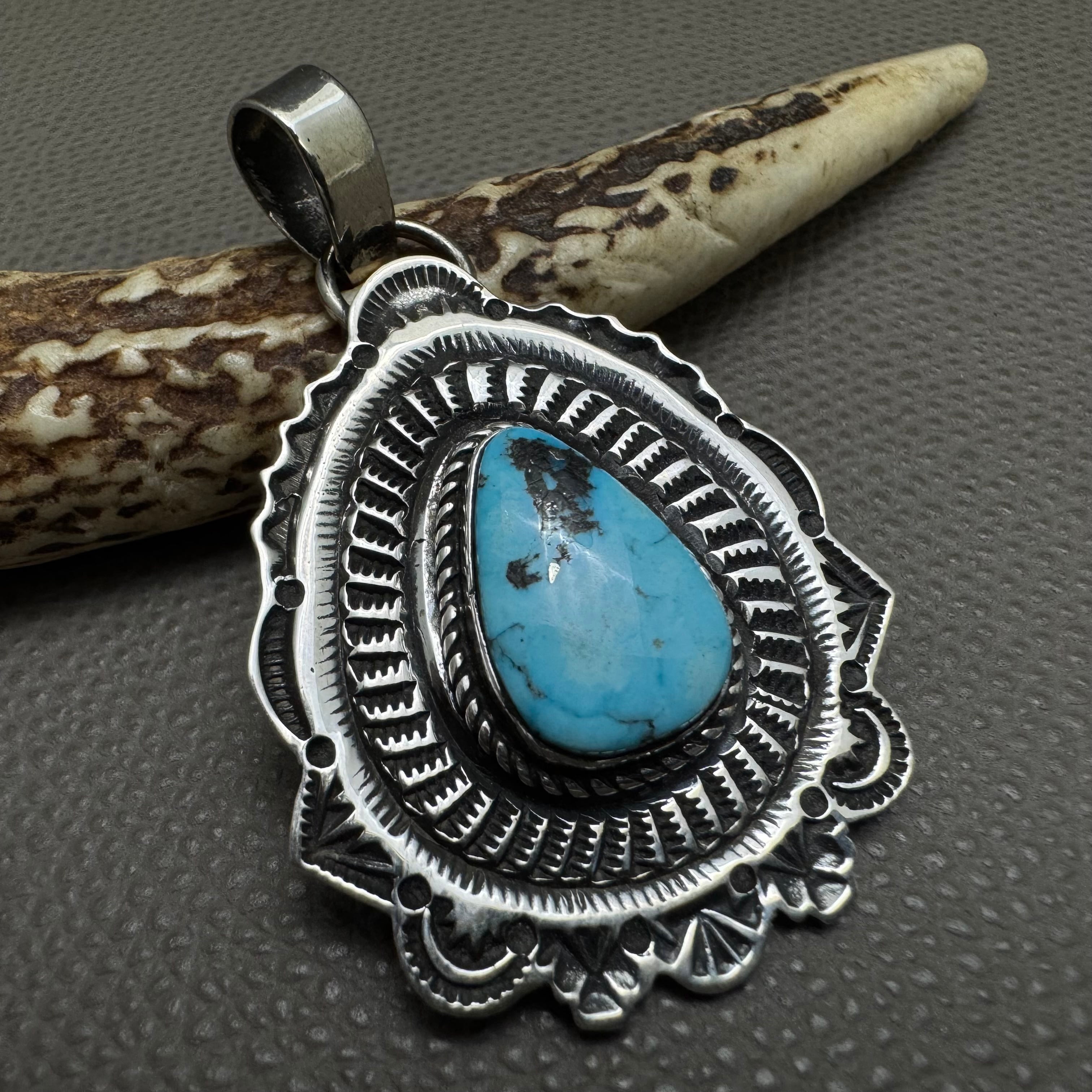 非常にきれいなターコイズがセットされており、力強いスタンプワークを細部まで施した存在感抜群のトップです。