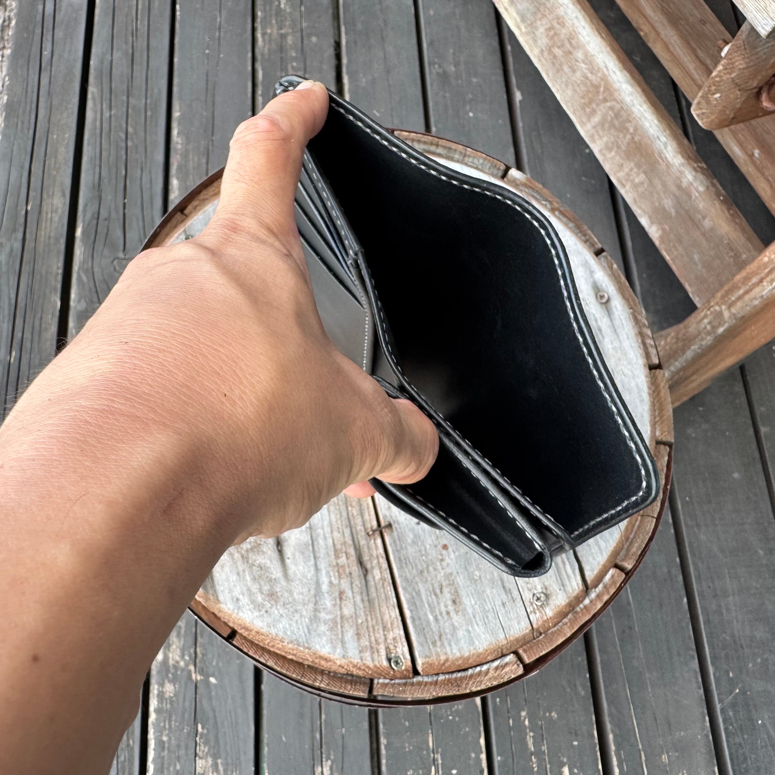 中パーツの革を薄くすることで使いやすさを追求し、なおかつ強度を持たせるために口部分に返し縫を施してます。