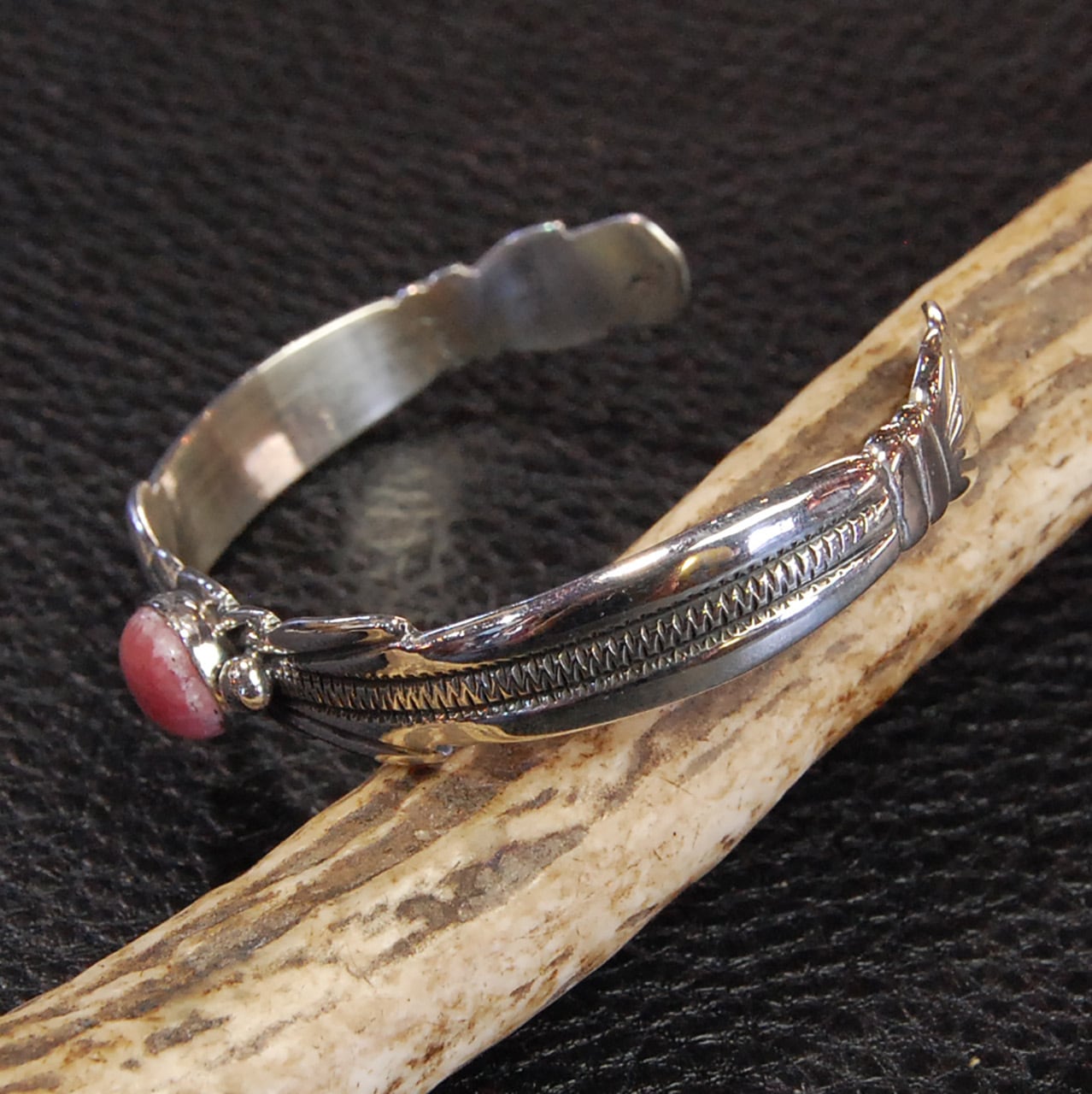 ナバホらしいスタンプワークの施されたバングルに、スパーニーオイスター、インカローズがはめ込まれたシンプルで細めながらも存在感は抜群です。