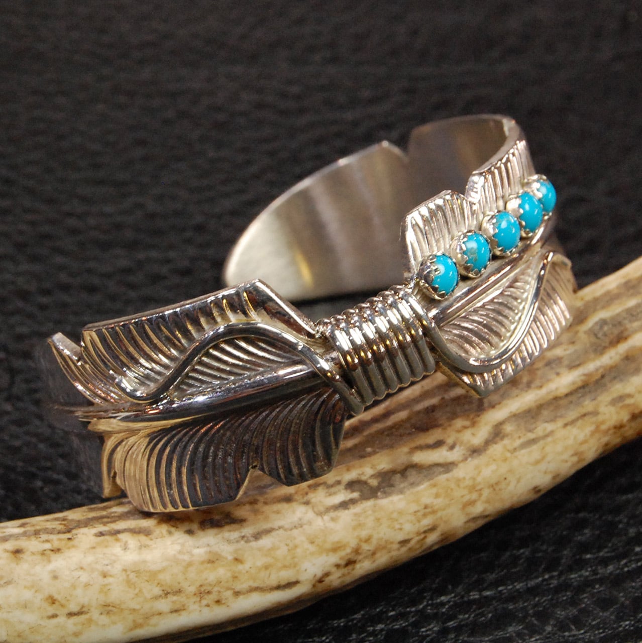 NAVAJO(ナバホ)族 Chris Charley作 フェザー&ターコイズバングル シルバー INDIAN ネイティブ ズニ ホピ アクセ ブレス 羽根 インディアンジュエリー