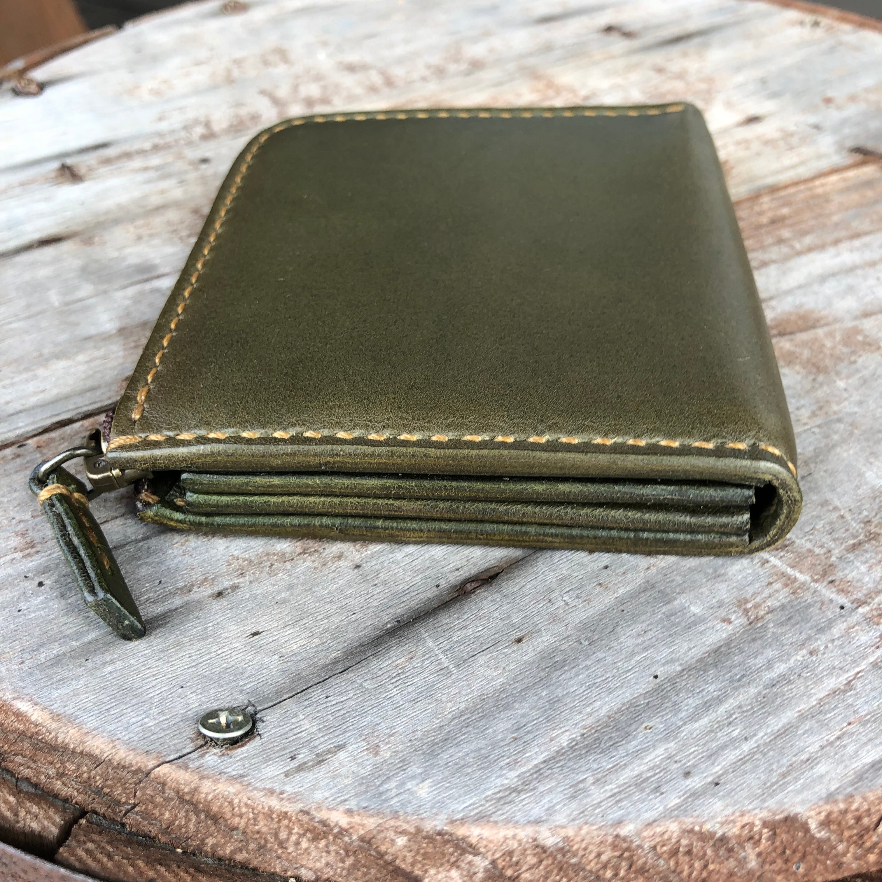 WHOLオリジナル L字ファスナーミニウォレット ハンドメイド 財布 本革 牛革 ウォレット コインケース 札ばさみ 手縫い グリーン レザーウォレット