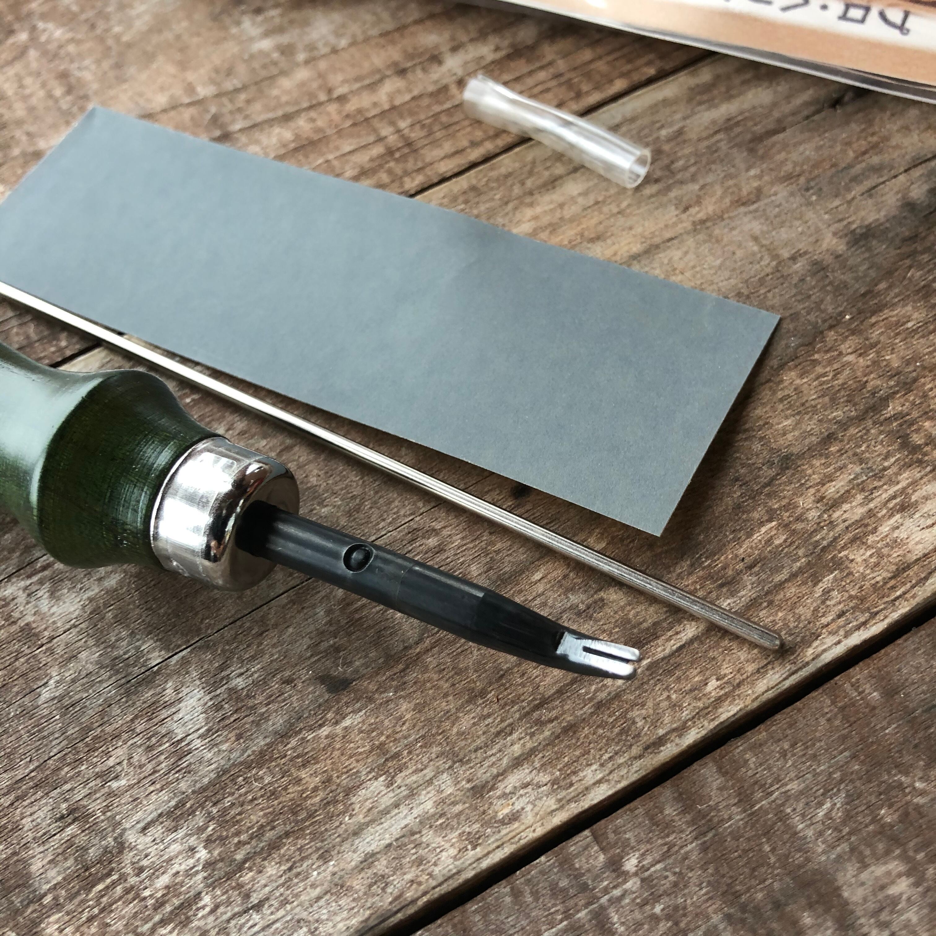 ※研ぎ方:机の上に研ぎ棒を置き、その上に耐水ペーパーをのせて指で固定し、角度を一定に保ち手前に引きながら研ぎます。