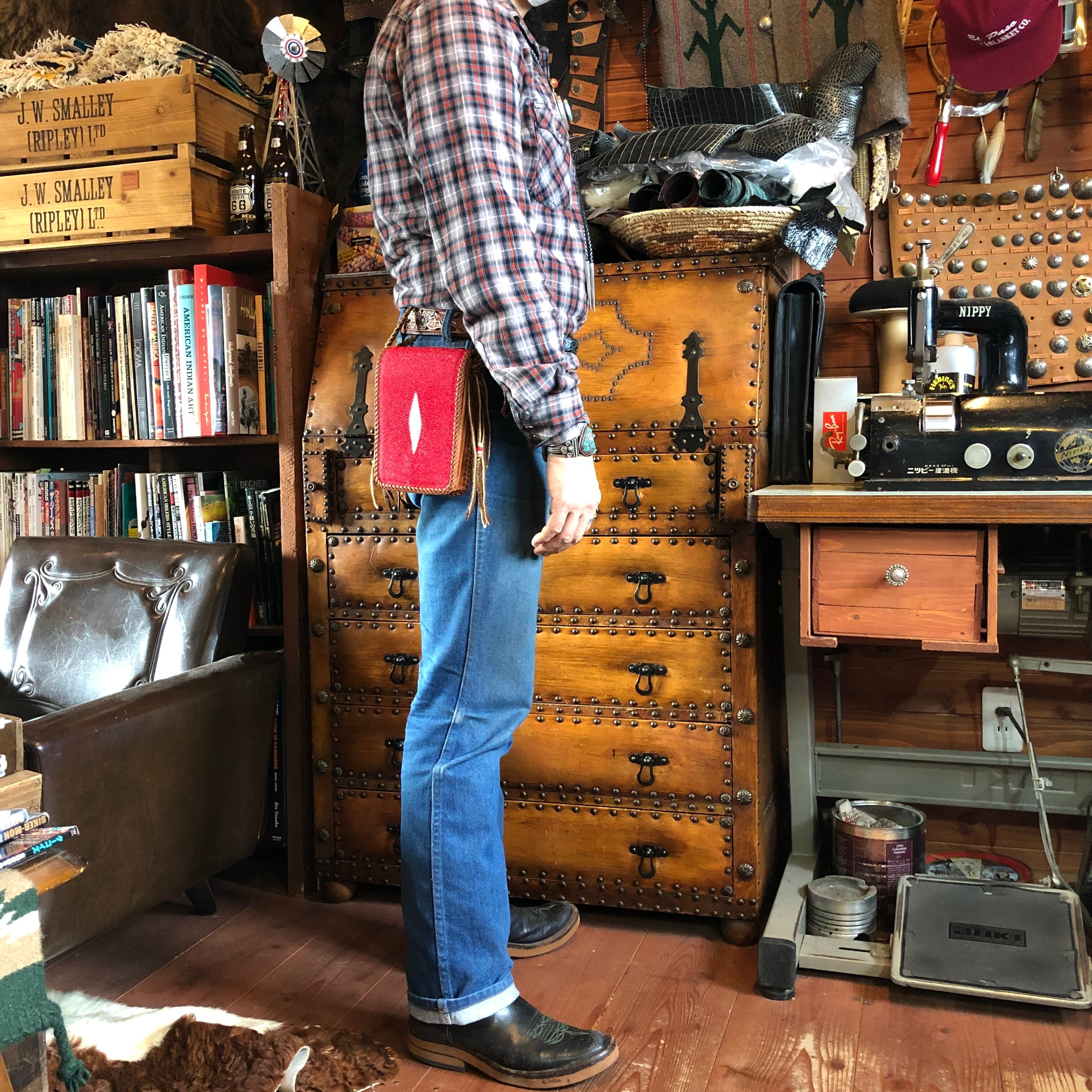 WHOLオリジナル スティングレイ 単石メディスンバッグS(ハードタイプ) NDIAN ネイティブ ヒップバッグ 本革 牛革 手縫い ハンドメイド ベルト 箱型 スマホポーチ スマホケース レザーポーチ レザーバッグ 赤 レッド エイ