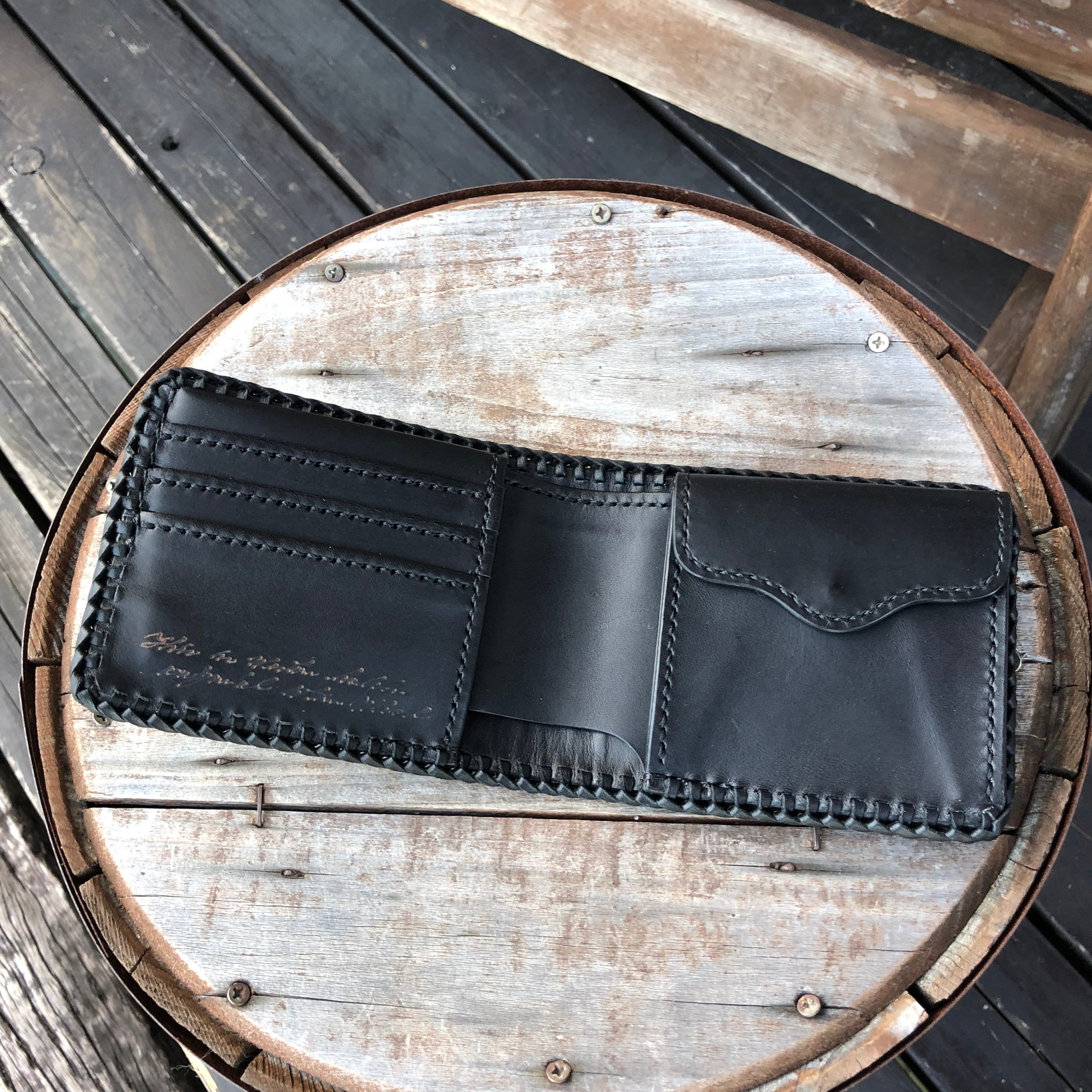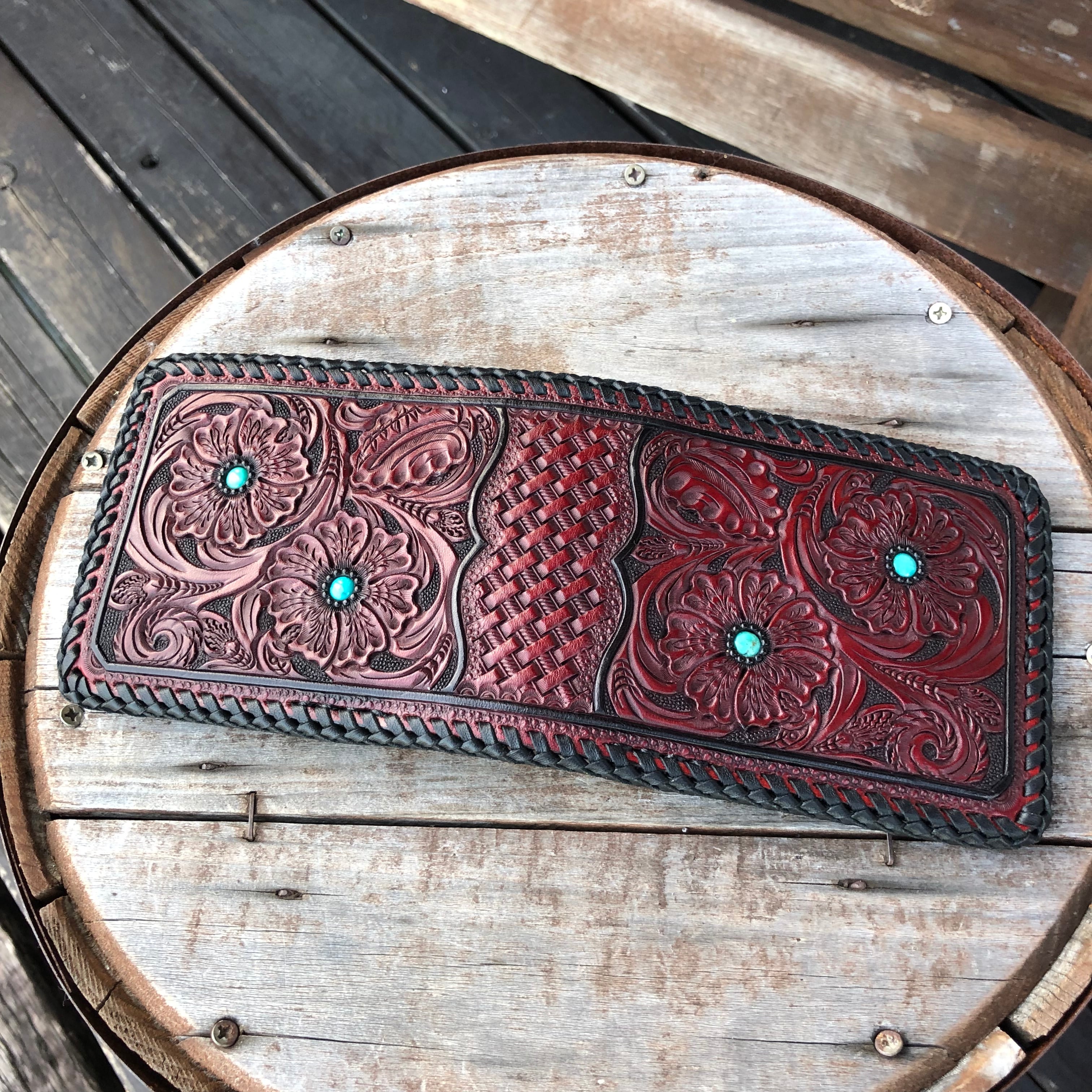 全面にシェリダンスタイルカービングとバスケットスタンプを施し、フラワーのセンターにはターコイズがインレイされた贅沢なクラフトウォレットです。