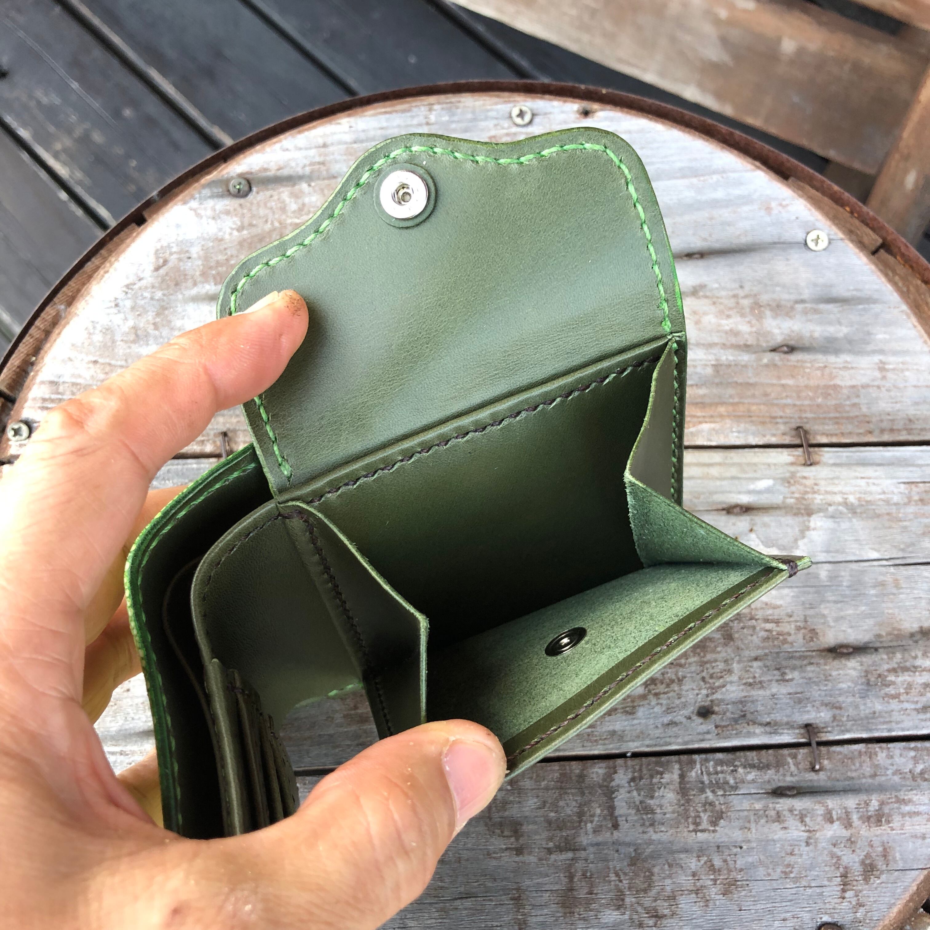 中パーツの革を薄くすることで使いやすさを追求し、なおかつ強度を持たせるために口部分に返し縫を施してます。