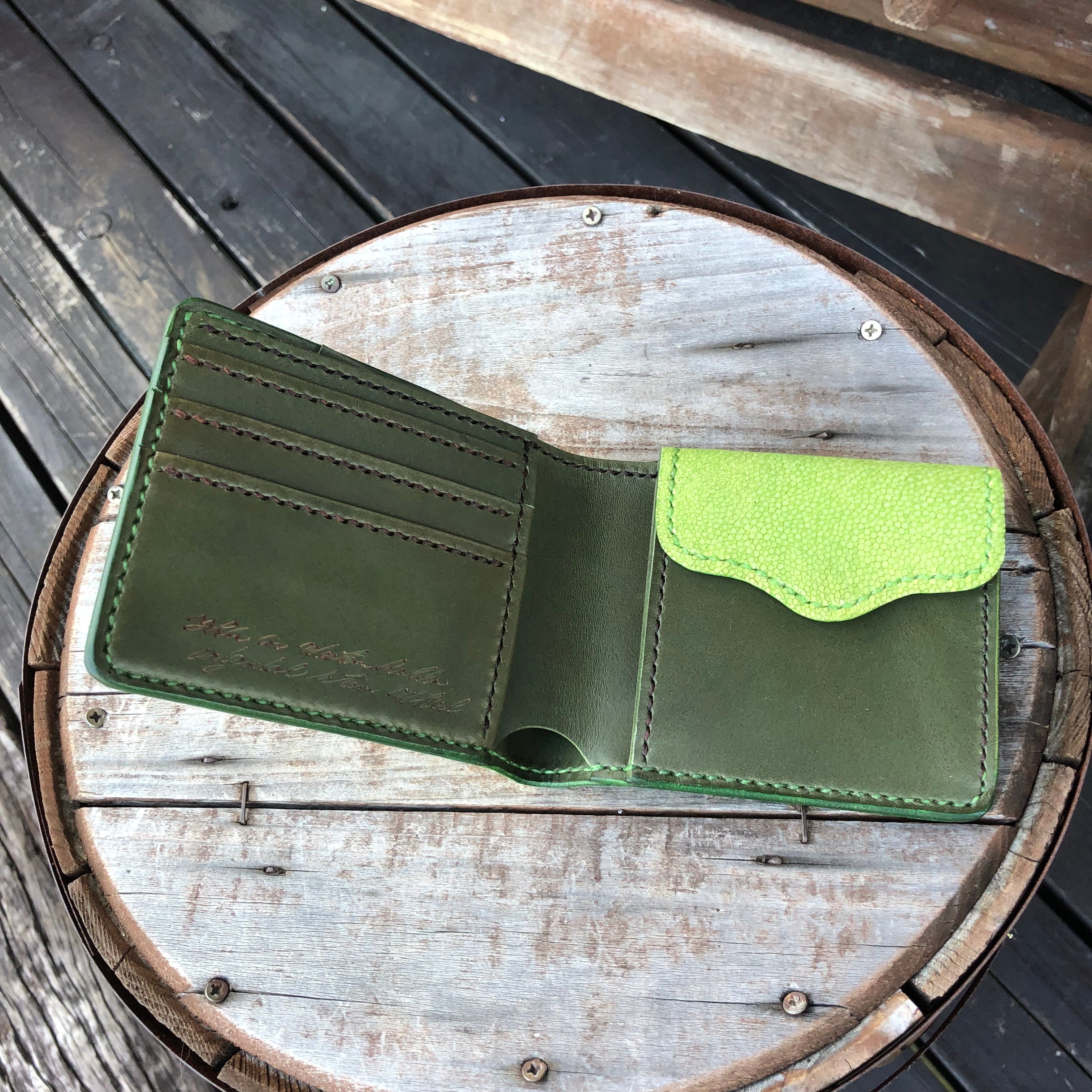 WHOLオリジナル ビルフォードL スティングレイレザー ※ ハンドメイド 財布 ウォレット エイ 本革 手縫い 二つ折り財布 レザーウォレット ミントグリーン