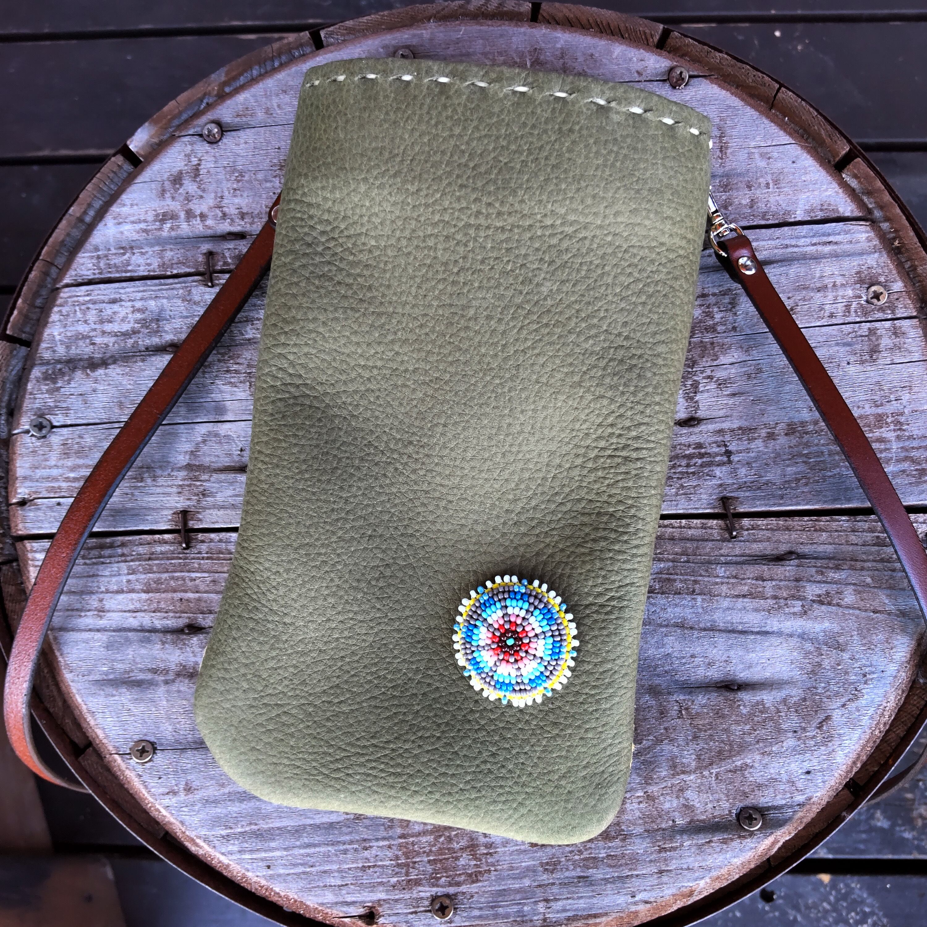 WHOLオリジナル スマホポーチ 本革 携帯 手縫い レザーポーチ レザーバッグ サコッシュ グリーン ビーズコンチョ