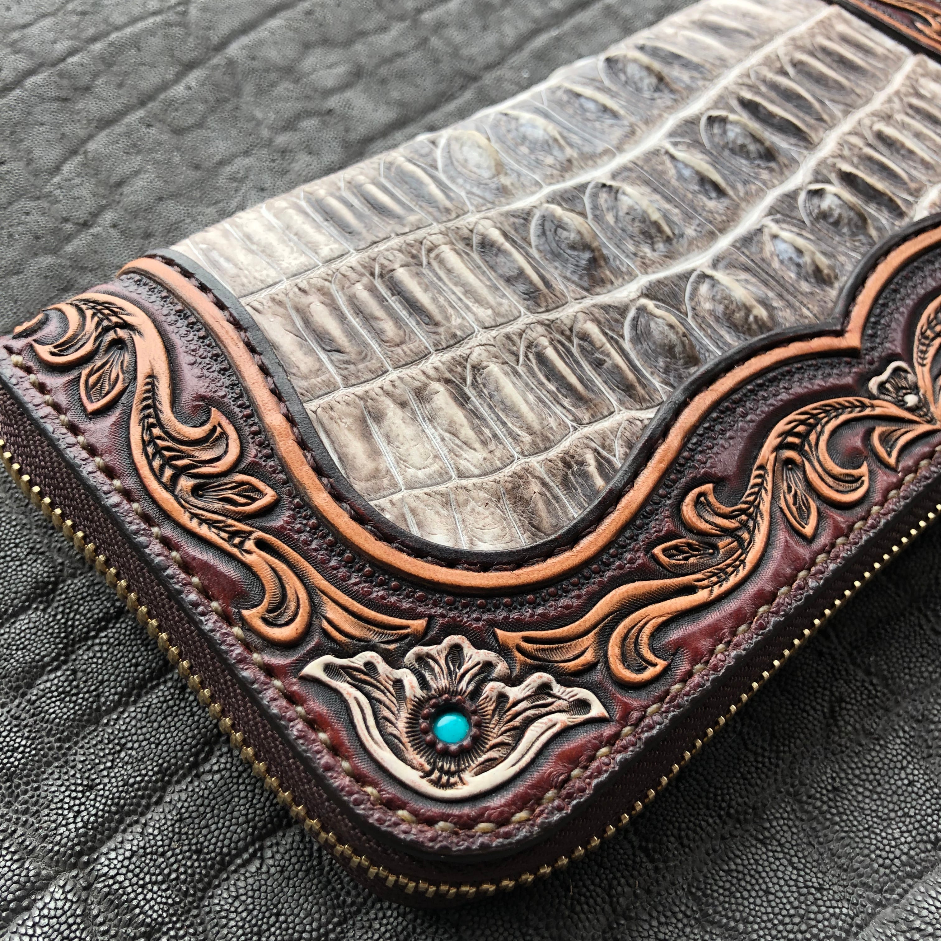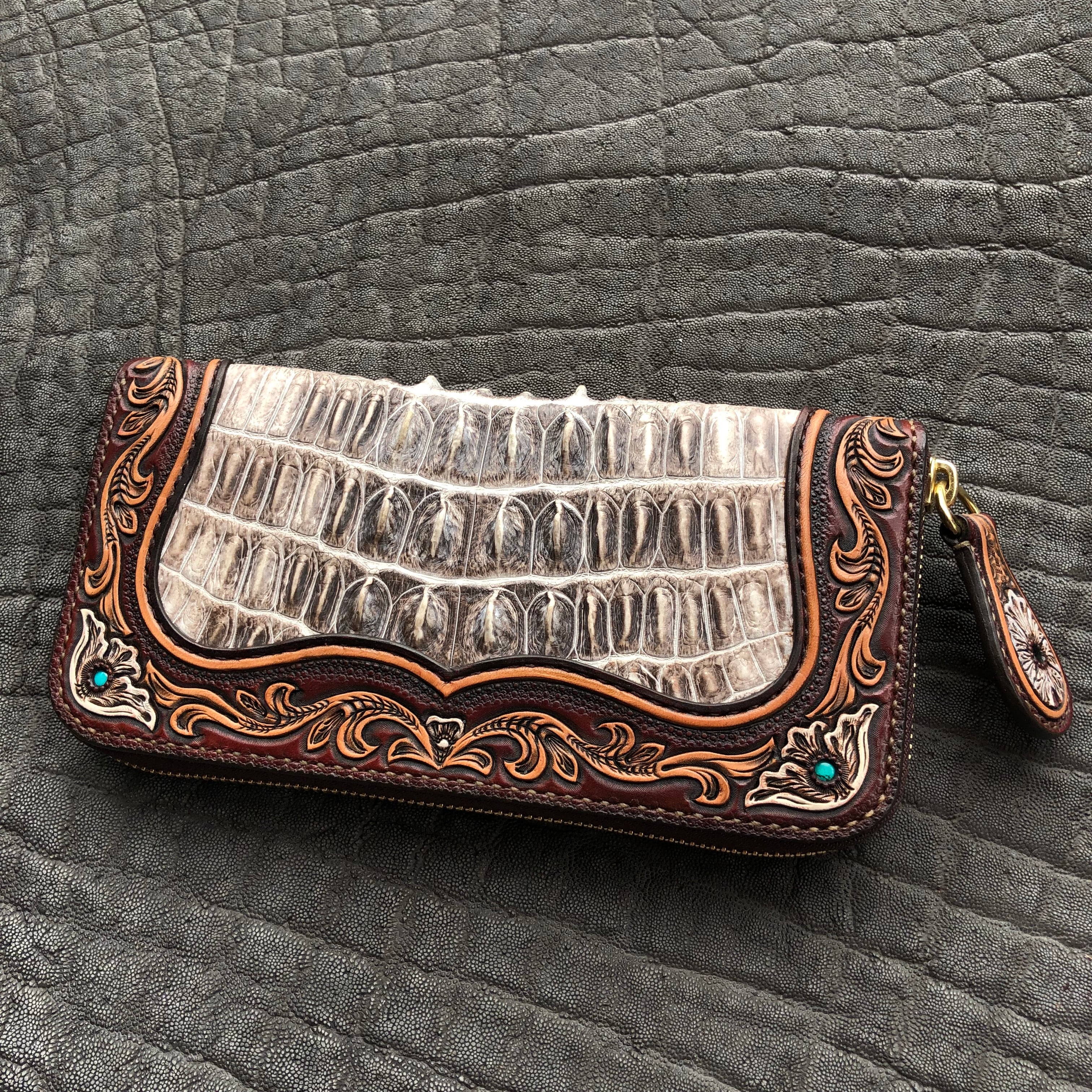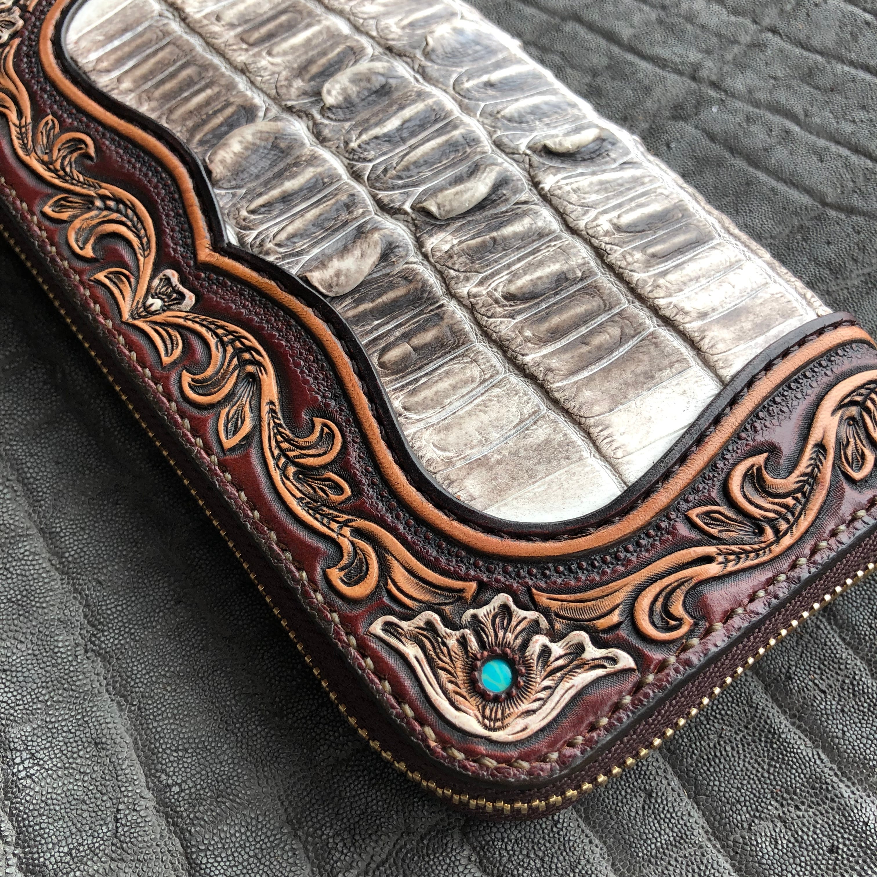 レザークラフトWHOL創業20周年アニバーサリーウォレット ラウンドファスナー カービング&クロコレザー ターコイズインレイ ヒマラヤカラー 手染め