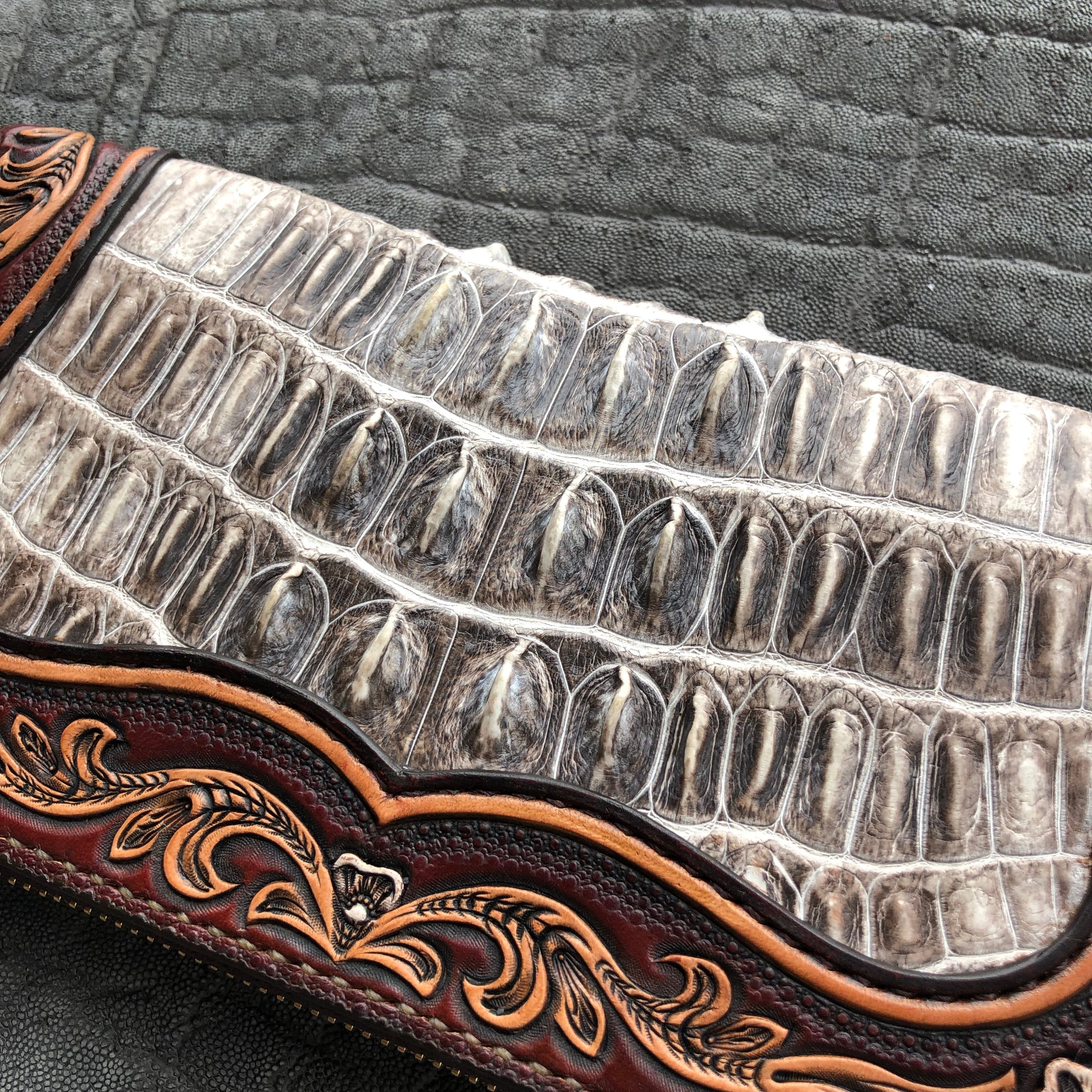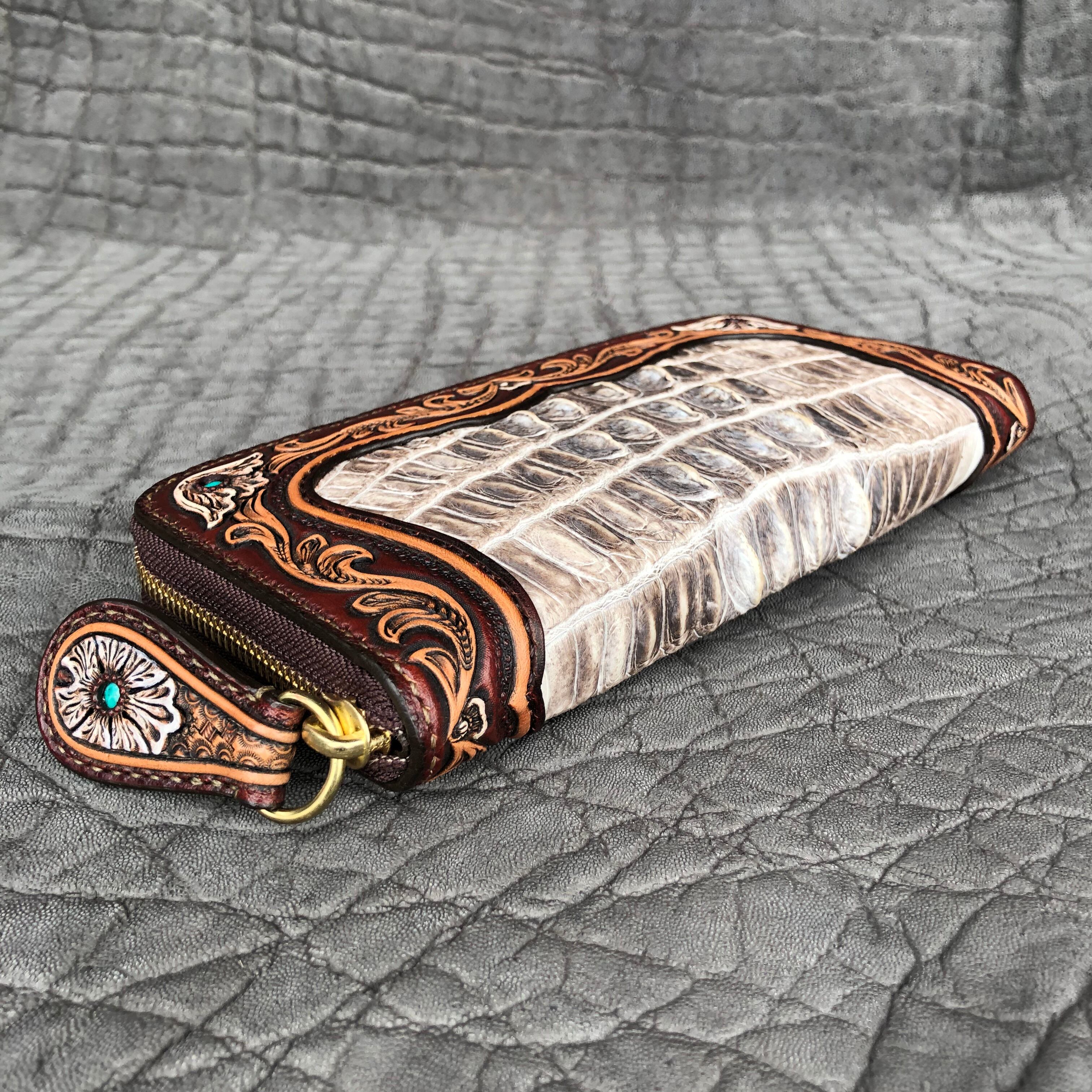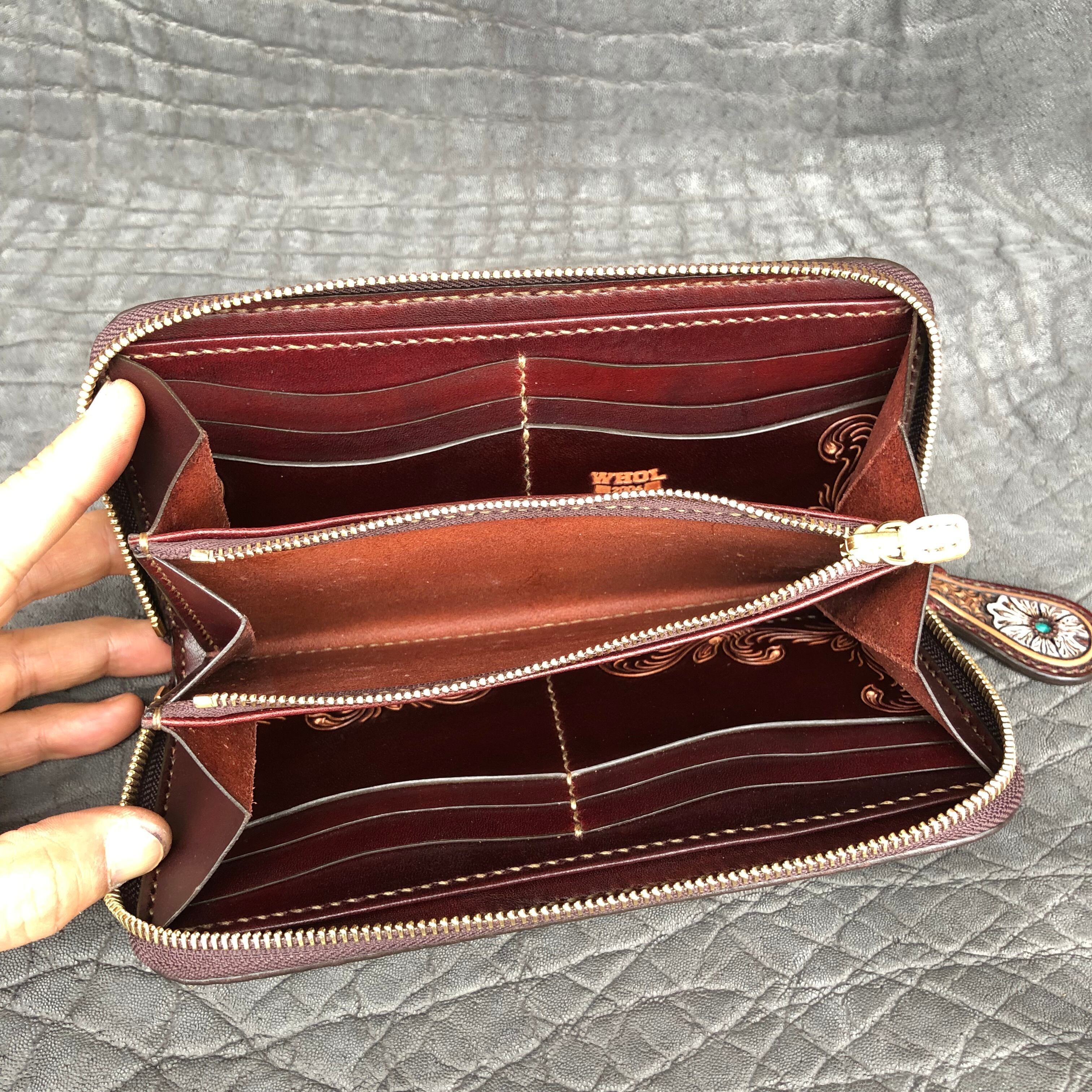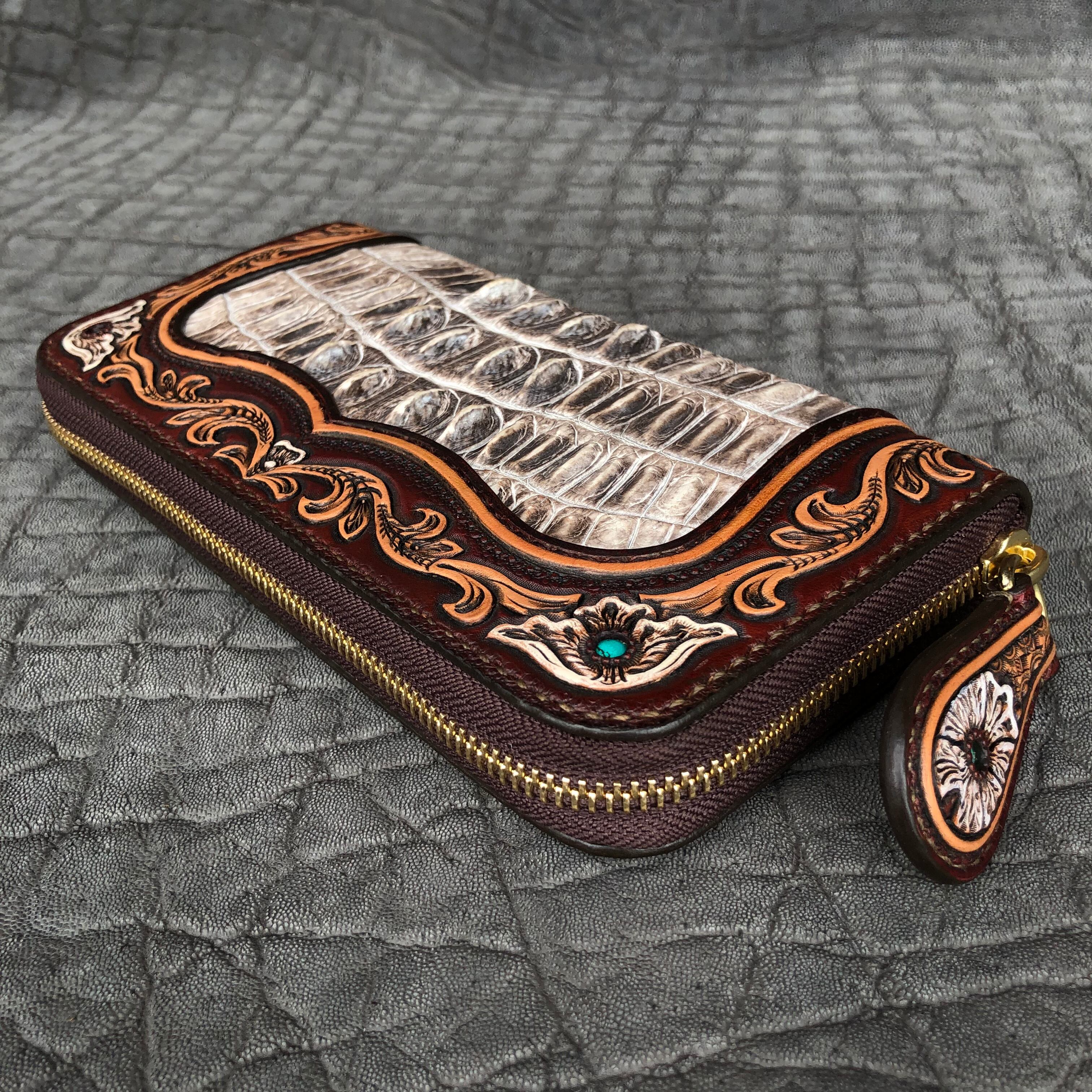 レザークラフトWHOL創業20周年アニバーサリーウォレット ラウンドファスナー カービング&クロコレザー ターコイズインレイ ヒマラヤカラー 手染め